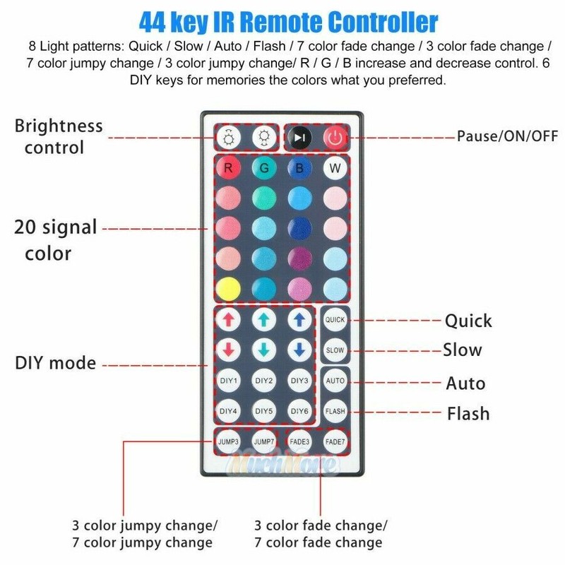 Brand New & Excellent quality Fast & free shipping from , US Features: • Waterproof Flexible LED Strip Kit: Waterproof 3528 RGB strip light and IR Controller and 44 Key Remote. Super bright but running at low temperature, low energy consumption, less heat radiation. (Power supply is include) • Color Changing: Light strip with 44keys IR remote controller for the LED tape can fit your all changing demand. You can choose different colors, adjust brightness, turn on/off. Stable lighting LED chips allows the LED lights to be very colorful and durable. • 44 key IR Remote Controller: 8 Light patterns: Quick / Slow / Auto / Flash / 7