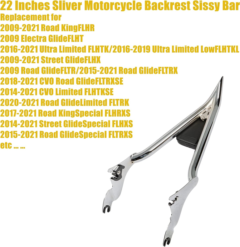 Store New Arrivals Add to Favorite View Feedback Contact22 Inches Motorcycle Backrest Sissy Bar Detachable W/Pad for Touring CVO Road Glide Street Glide Road King Electra Glide 2009-2021 SliverDescription Item model number Does Not Apply Color Sliver Country of Origin China Manufacturer Part Number DY-9501333-163898-GX Item Weight 9.19 pounds Voltage 736 Volts Special Features 150 Product Dimensions 32.68 x 15.75 x 5.12 inches Size 22 Inches for 2009-2021 Touring CVO Road Glide Road King Road Glide Street Glide Electra Glide Ultra Limited Ultra Limited LowMade of high quality steel metal & PU Leather and Polyurethane Foam materials, stable and comfortableFinish in black powder coating by well welded for strong solid and durableDetachable design, easy installation and removalIt can provide great back support and long haul trip riding-comfort with the soft cushion pad Description: 22 Inches Motorcycle Backrest Sissy Bar Detachable w/pad for Touring CVO Road Glide Street Glide Road King Electra Glide 2009-2021 Sliver Fitment: for 2009-2021 Touring: 2009-2013 Road KingClassic FLHRC 2009-2013 Electra GlideClassic FLHTC 2010-2013 Road GlideCustom FLTRX 2010-2012 Street GlideCVO FLHXSE/FLHXSE2/FLHXSE3 2015-2021 Street GlideCVO FLHXSE 2011 Road GlideCVO Ultra FLTRUSE 2009-2021 Road KingFLHR 2009 Electra GlideFLHT 2016-2021 Ultra Limited FLHTK/2016-2019 Ultra Limited LowFLHTKL 2009-2021 Street GlideFLHX 2018-2021 CVO Road GlideFLTRXSE 2014-2021 CVO Limited FLHTKSE 2020-2021 Road GlideLimited FLTRK 2017-2021 Road KingSpecial FLHRXS 2014-2021 Street GlideSpecial FLHXS 2015-2021 Road GlideSpecial FLTRXS 2015-2019 Electra GlideUltra Classic FLHTCU 2009-2014 Electra GlideUltra Classic FLHTCU 2011-2013 2016-2019 Road GlideUltra FLTRU 2010-2015 Electra GlideUltra Limited FLHTK Feature: 1.Made of high quality steel metal & PU Leather and Polyurethane Foam 2.Detachable design, easy installation and removal 3.Finish in black powder coating by well welded Specifications: Type: Passenger Backrest Color: Sliver Tall: 22 Inches Material: Metal Steel+PU Synthetic Leather+Polyurethane Foam Package Include: 1 Set of Sissy Bar Backrest ABOUT US We offer the best prices around on high quality products. Our E-store includes media such as books, movies, music and games while offering electronics, toys, sporting apparel, clothing, tools, general home, garden items and more.SHIPPING We are always working hard to ensure your package arrives as soon as possible. Please understand that some factors like weather, high postal traffic, and the performance of shipping companies are outside of our control.We offer free shipping to the lower 48 states and ship within 2 business days of payment, usually sooner. We do not accept P.O. Boxes. Please provide a physical address.For shipping outside of the continental USA, we only use eBays Global Shipping Program.The item is shipped to KY and then sent to the rest of the world. International customers are responsible for all duties and taxes. Continue to check out in order to calculate costs for shipping the item to your country. Messages regarding eBays Global Shipping Program MUST be directed at eBay EXCLUSIVELY.RETURNS We offer a 30-Day Return Policy on items which you are not completely satisfied with. You have the option for a full-refund or an exchange of the item. No returns are available on items shipped outside of the USA.PAYMENT We accept PayPal.CONTACT US This page content is yet to comePlease ad us to your favorite seller and visit again laterThank YouCUSTOMER SATISFACTION We try our very best to make sure every customer is completely satisfied. If theres a problem, message us! Were happy to help.WE ACCEPTCopyright © 2021 AutoDS. | All Rights Reserved