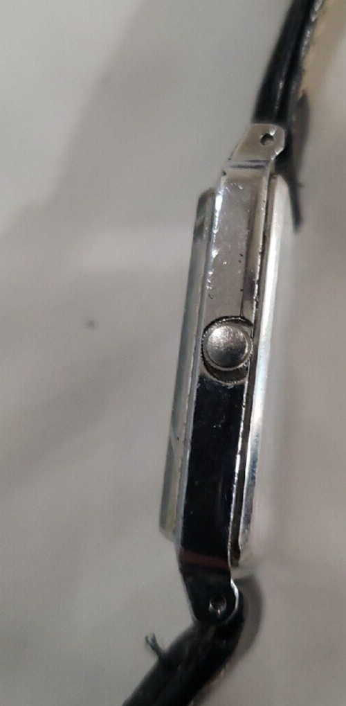 This vintage Citizen watch features a black two-piece strap with a buckle closure. The square silver dial has stick indexes and a 12-hour bezel type. The watch is from the 1980s and has a reference number of 1022H14231. The case is made of stainless steel with a chrome finish. The quartz movement has features like a screwdown crown, push/pull crown, and seconds hand.Needs a new Battery.