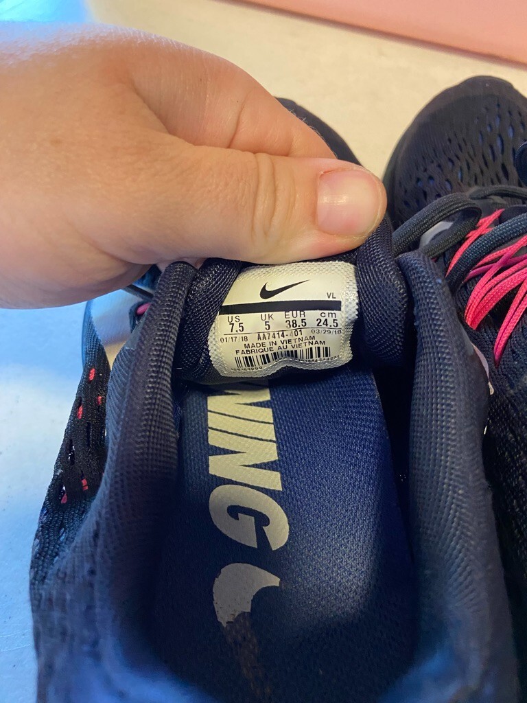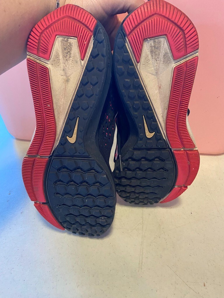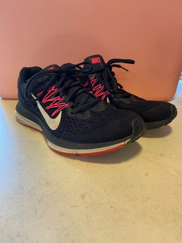 Nike Air Zoom Winflo 5 women’s running shoes in size 7.5 (model AA7414-401). This pre-owned pair is in good condition and may show normal signs of wear from prior use. Please review the listing photos and description for exact details on the item’s appearance, included accessories (if any), and fit. Free shipping is included with purchase, and the shoes will be packed for safe delivery. Check the listing for details.