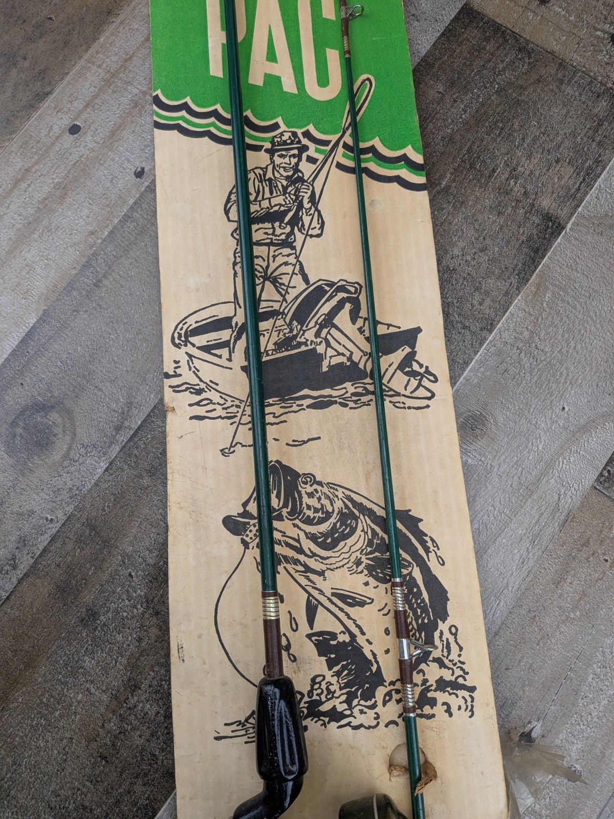 I do not believe the pole or the reel have ever been removed from the cardboard. The cardboard does have age damage and the rod slots are torn. The original plastic shrink wrap is mostly missing and what is left is badly damaged. The rod and reel are both in great condition. Minor wear and dust on both from being stored for many years.