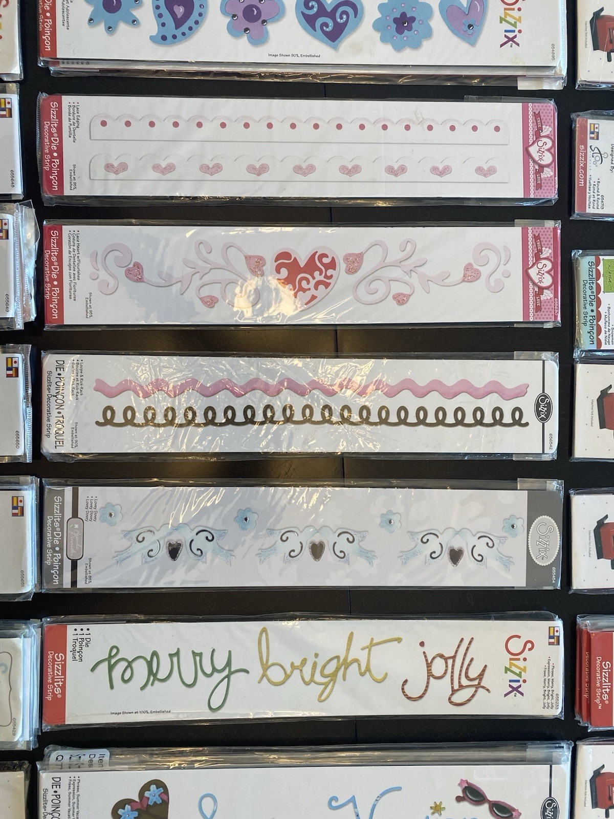 Choice of Sizzix Sizzlits Decorative Strips Thin Cut DiesSelect your choice of Sizzix Sizzlits Decorative Strips Thin-Cut dies. Select the drop down list to see all of the options available. The sizzlit dies are thin-cut type dies and measure 2 3/8" x 12 5/8". These dies can be used with the Sidekick machine (with the extended clear plastic plates), and the Big Shot/BigKick roller style machines and Cuttlebug (with proper plate sandwiching). Each additional sizzlit decorative strip after the first will add 1.00 to the shipping cost. Combined shipping will automatically calculate if you add all items to your cart and purchase in a single transaction. Please contact me if combined shipping does not appear to calculate properly.Check my other sizzlit choice listings and have all of your selections shipped together to save money. Be sure to put them all in your cart before purchasing to get the combined shipping rate.Thank you for looking and happy crafting!