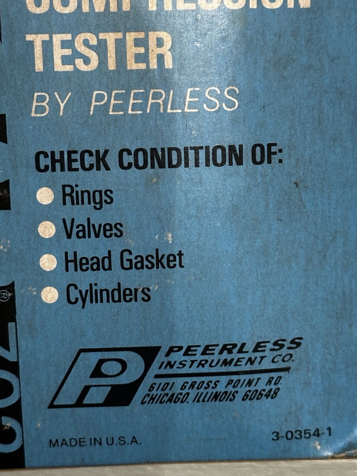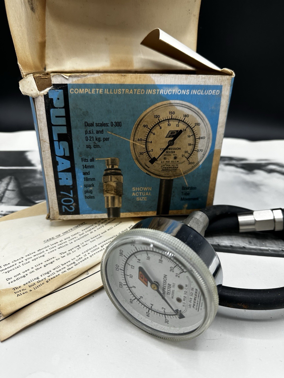 Vintage Peerless Instrument Co. PULSAR 702 Flex-Drive Compression Tester.New Old Stock — never used — includes original box, tester, hose, and illustrated instructions. Box shows shelf wear from decades of storage, but the tool itself is clean.✔ Made in USA – Chicago, Illinois✔ Tests cylinders, rings, valves, head gasket condition✔ Complete kit — shown in photos✔ Great for mechanics, collectors, or vintage tool displayCondition: NOS – unused, box has wear, light oxidation marks on box only from age.Ships fast and packaged with care!