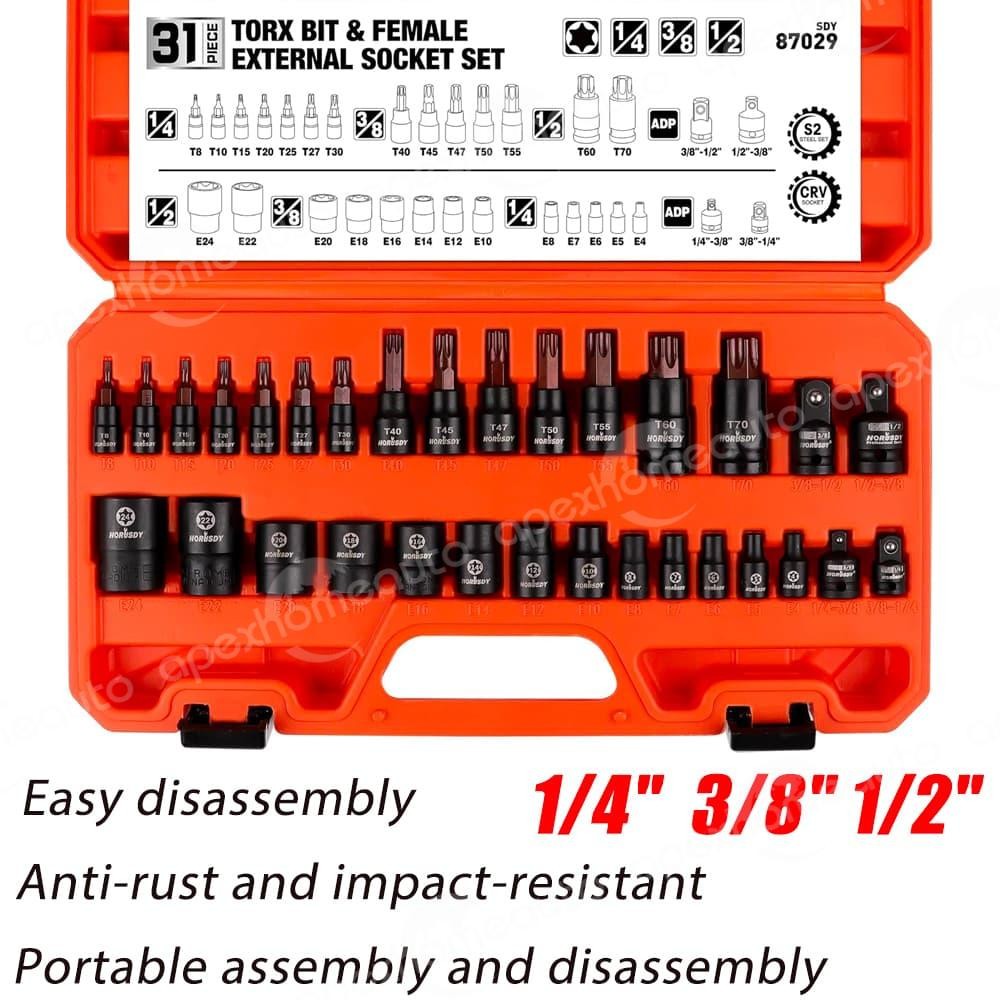 size markings are easy to read and wear-resistant, ensuring quick identification even in low light. Includes a sturdy storage box for convenient organization and transport.Complete Mechanic Set – Includes 14pcs solid Torx bits (T8, T10, T15, T20, T25, T27, T30, T40, T45, T47, T50, T55, T60, T70) and 13pcs female E-Torx sockets (E4, E5, E6, E7, E8, E10, E12, E14, E16, E18, E20, E22, E24).Socket Adapters – 4-piece impact-grade adapter and reducer kit includes 1/4"(F) to 3/8"(M) - 3/8"(F) to 1/4"(M) - 3/8"(F) to 1/2"(M) - 1/2"(F) to 3/8"(M).Product Style:1*Torx Bit Socket (31-Piece ) About Us Shipping Returns Contact Us Our auto parts store is the professional choice in the field of auto parts.In terms of products, the store displays a wide range of auto parts products. 1. Your order will be processed within 24 hours on business days after payment (excluding weekends and public holidays). Your item will be shipped via USPS within 3-6 business days. 2. We only ship to eBay confirmed addresses. Please make sure your address and zip code on eBay are the same as your shipping address before making payment. 3. seller is not responsible for the service shipping time, but we will help you to contact the local office. Shipping times are provided by the carrier, exclude weekends and holidays, and may vary depending on the origin and destination of the package, especially during peak periods. 1.)We will work hard to make sure every customer 100 percent satisfied, and reslove any problem for you. We sincerely hope that you can leave us a positive comment once you received the item,We also will leave a positive feedback immediately after payment is received. If for some reason there is any issue with the purchase, please contact us through "My Messages" or "Ask Seller Questions" before leaving neutral or negative feedback,we will be glad to work with you to have it resolved. Our working time: Monday to Friday, 9:00~18:00 How to send a return request:Attention: Please contact us via ebay message like the way shown above before starting a return request, so we can deal with your issue quickly and efficiently.1.Return this item. 2. Select a reason: please choose "It's the wrong