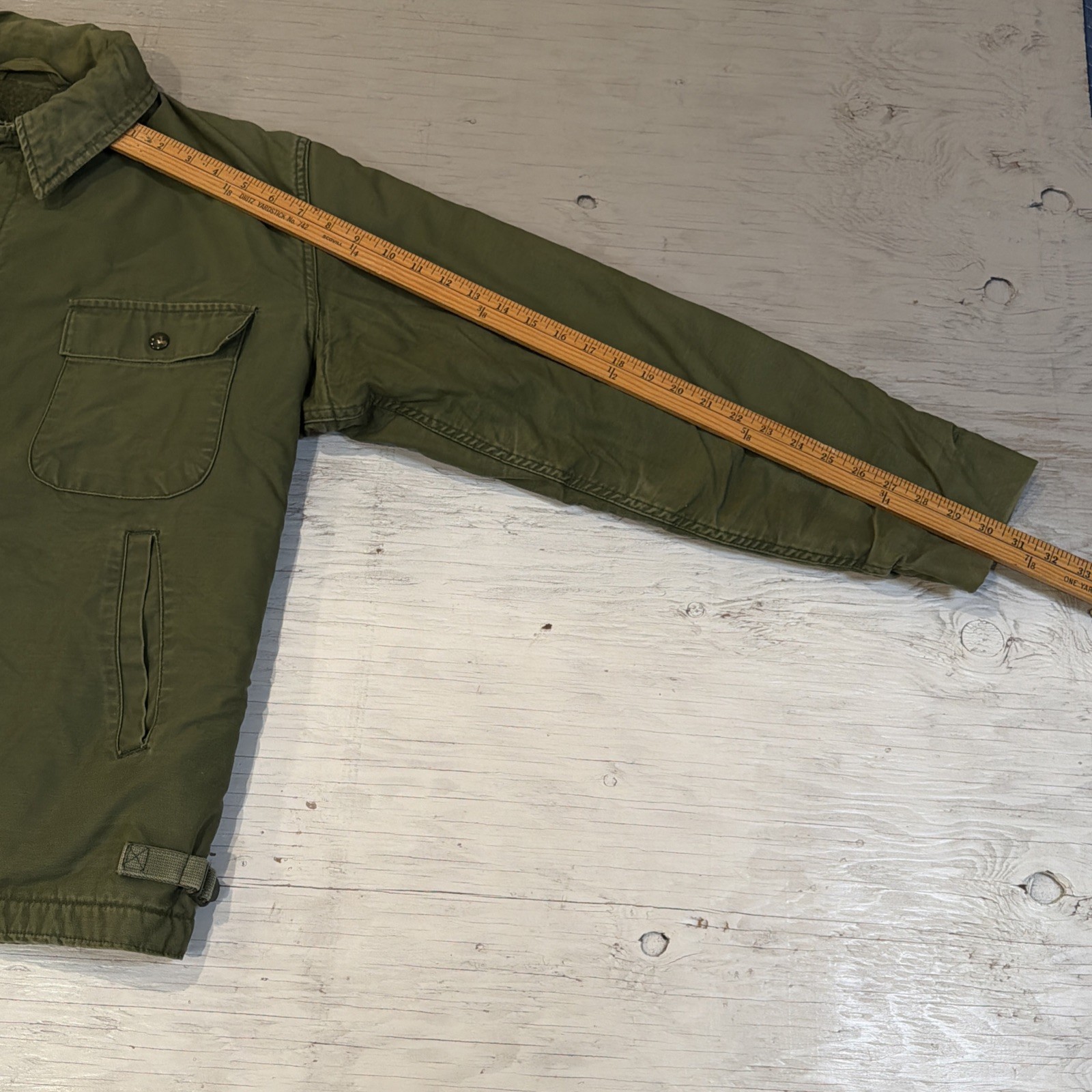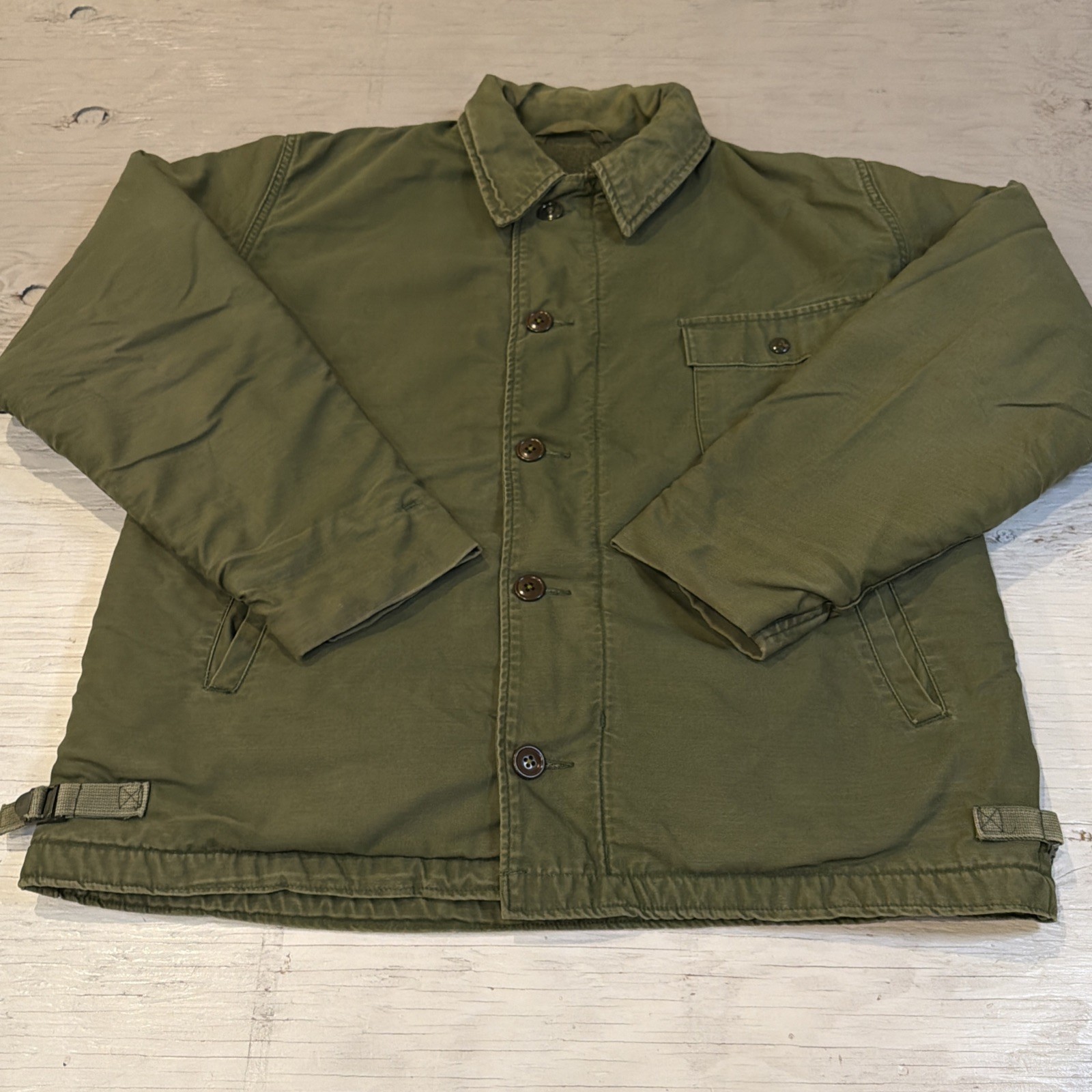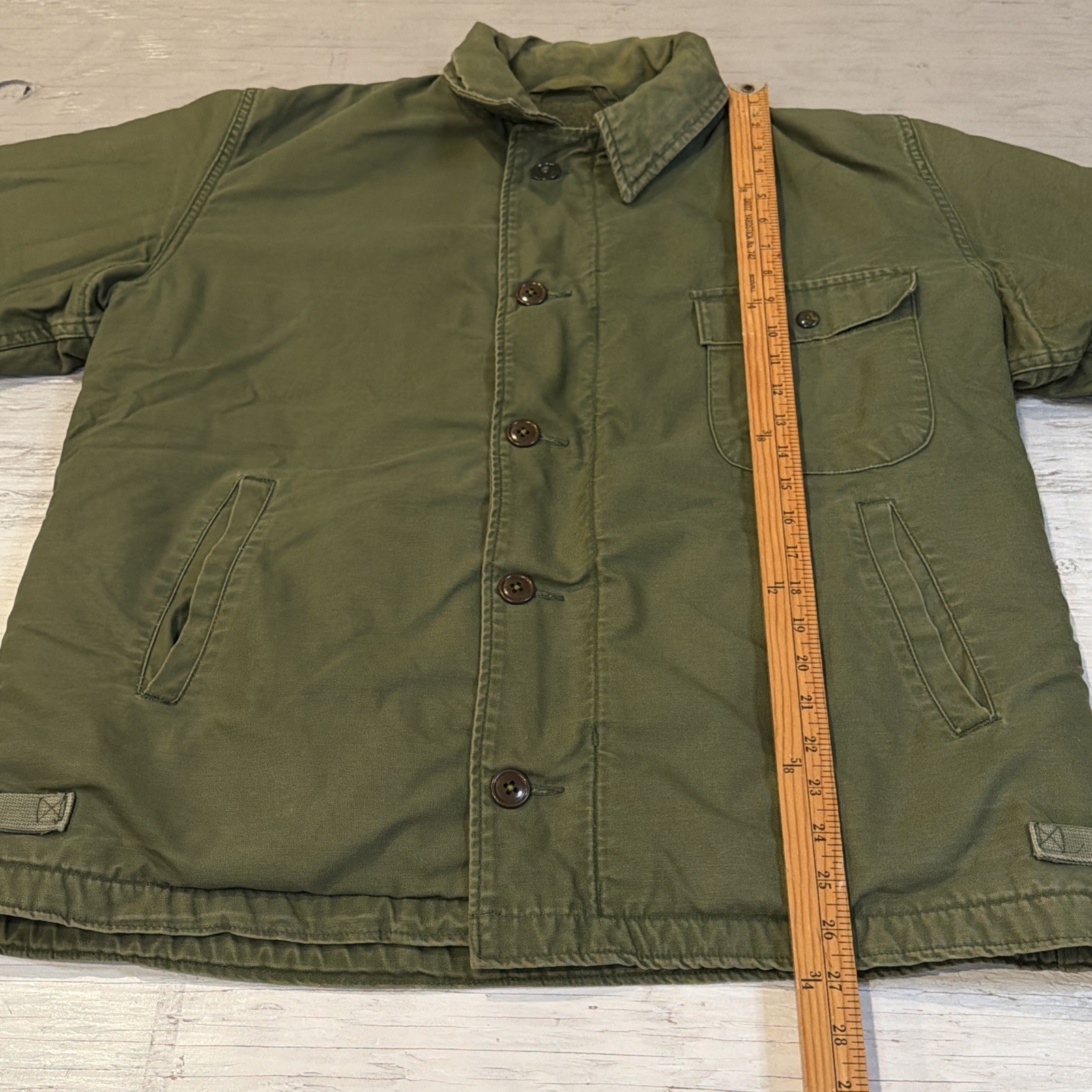 Vintage 1962 USN Navy A-2 Cold Weather Permeable Deck Jacket Vietnam Era Large - Shipped USPS priority mail- Please check measurements for proper sizing- Size tag is washed out, check measurements carefully - Please check photos for accurate description- marked distressed areas W/ yard stick in photos- jacket has some fading - Cold Weather Permeable Jacket, NSN 8415-00-753-5613—often referred to as the “deck coat” or permeable A-2. You’ll notice its olive-green OG-107 shell with full lining, branded zippers, and classic convertible collar—characteristics common among mid-20th century US military cold-weather gear