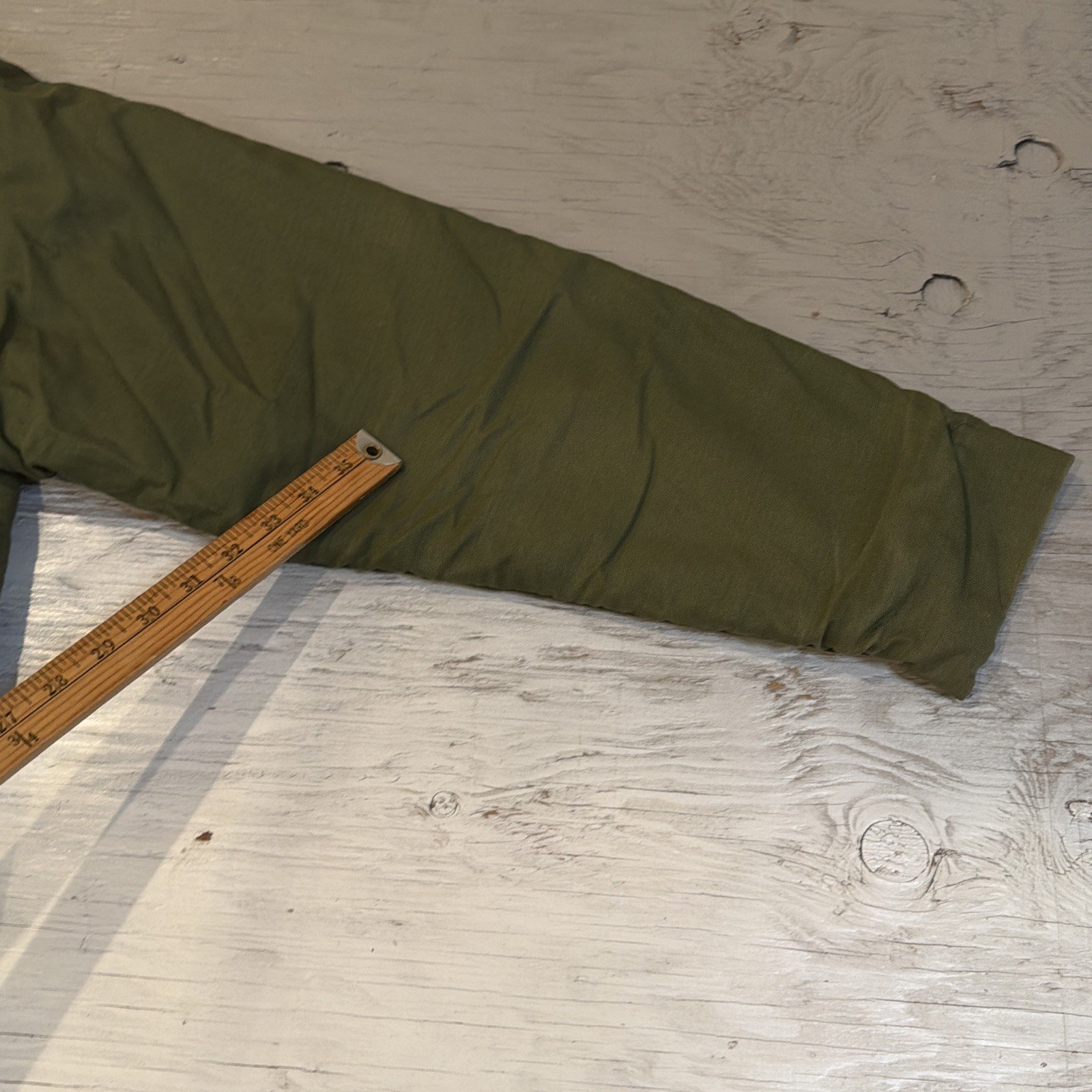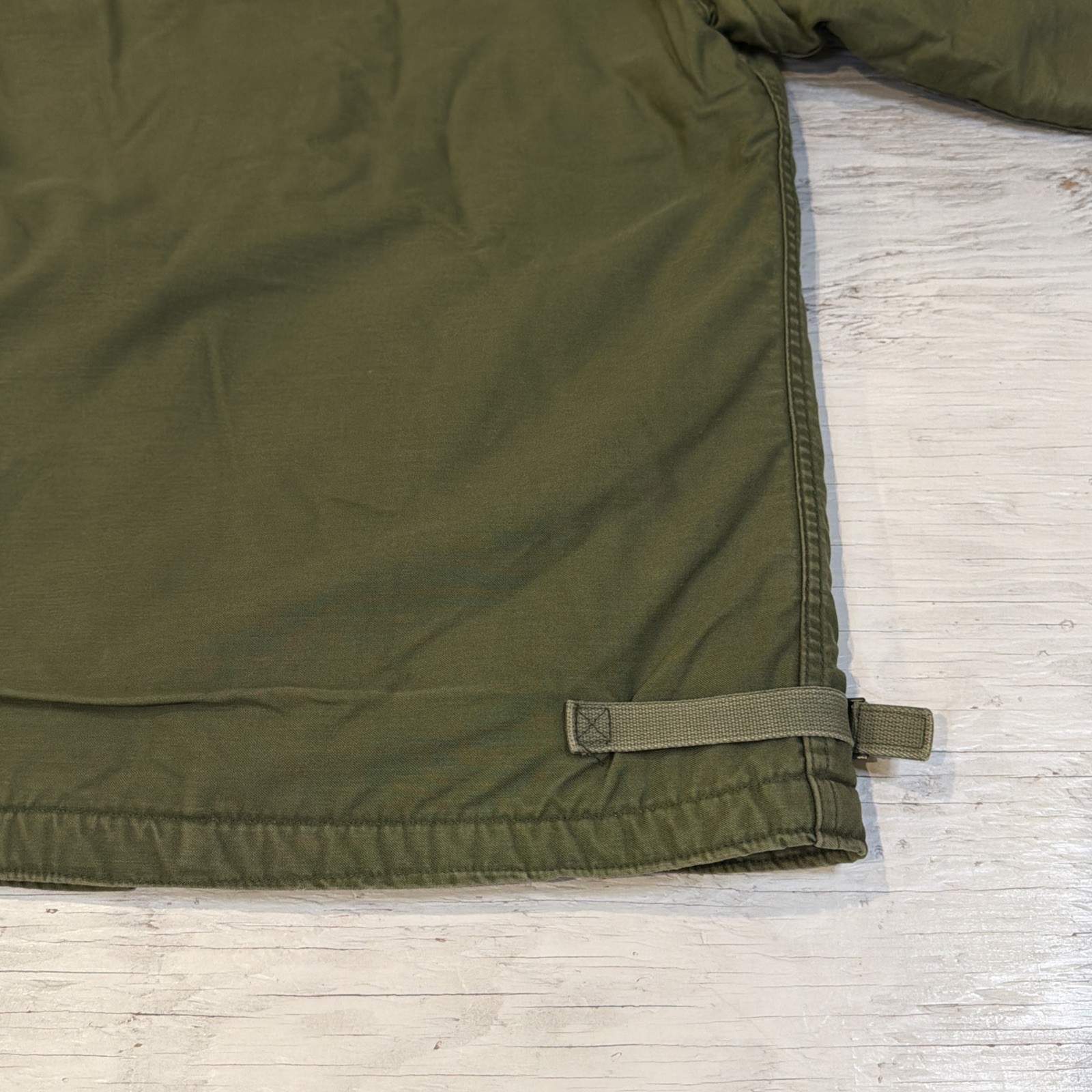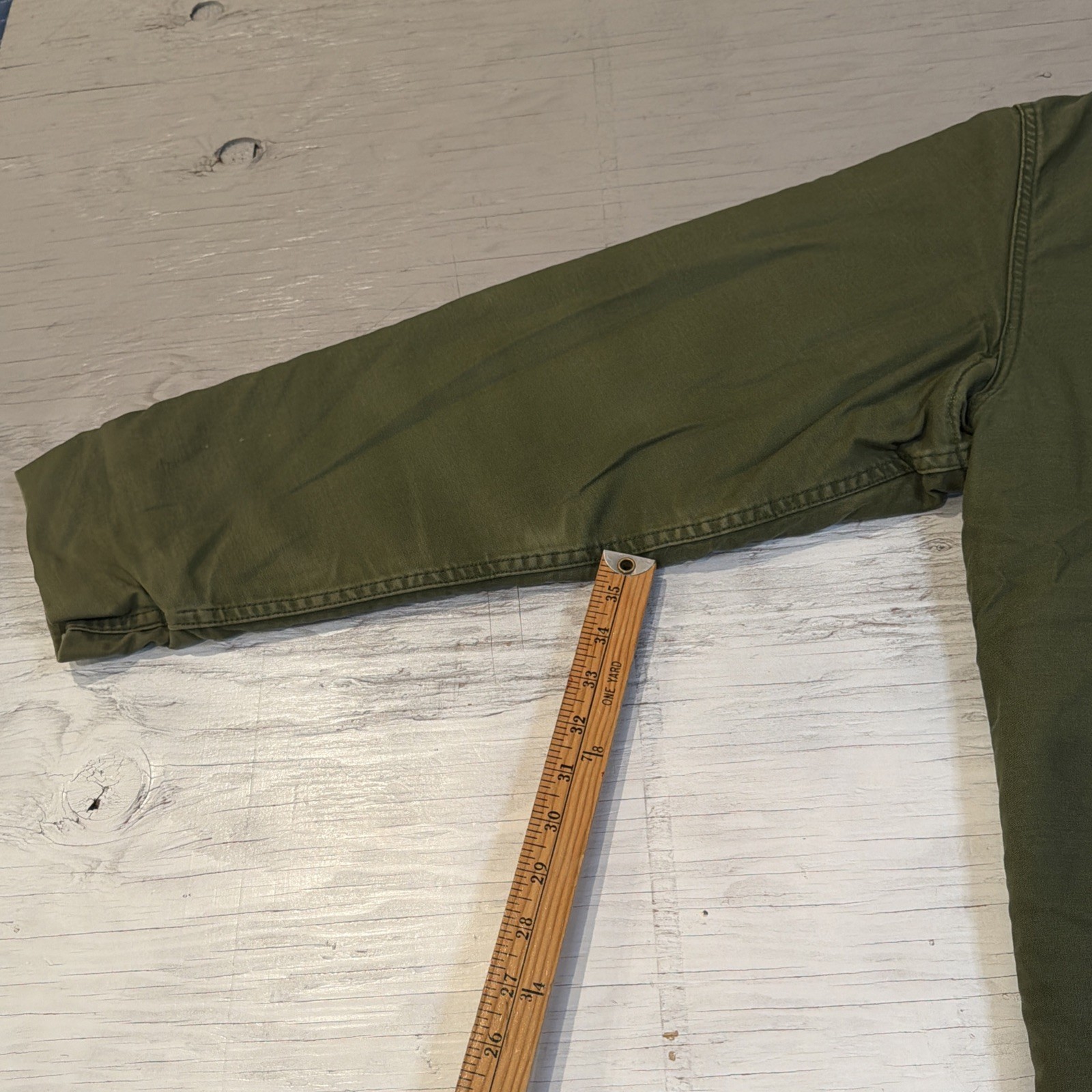 Vintage 1962 USN Navy A-2 Cold Weather Permeable Deck Jacket Vietnam Era Large - Shipped USPS priority mail- Please check measurements for proper sizing- Size tag is washed out, check measurements carefully - Please check photos for accurate description- marked distressed areas W/ yard stick in photos- jacket has some fading - Cold Weather Permeable Jacket, NSN 8415-00-753-5613—often referred to as the “deck coat” or permeable A-2. You’ll notice its olive-green OG-107 shell with full lining, branded zippers, and classic convertible collar—characteristics common among mid-20th century US military cold-weather gear