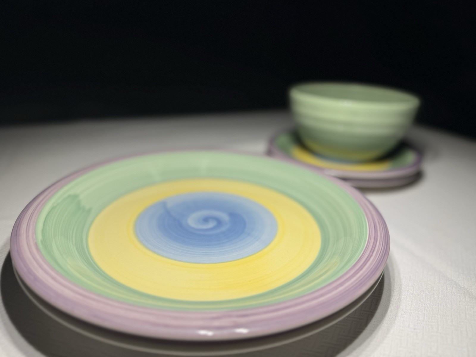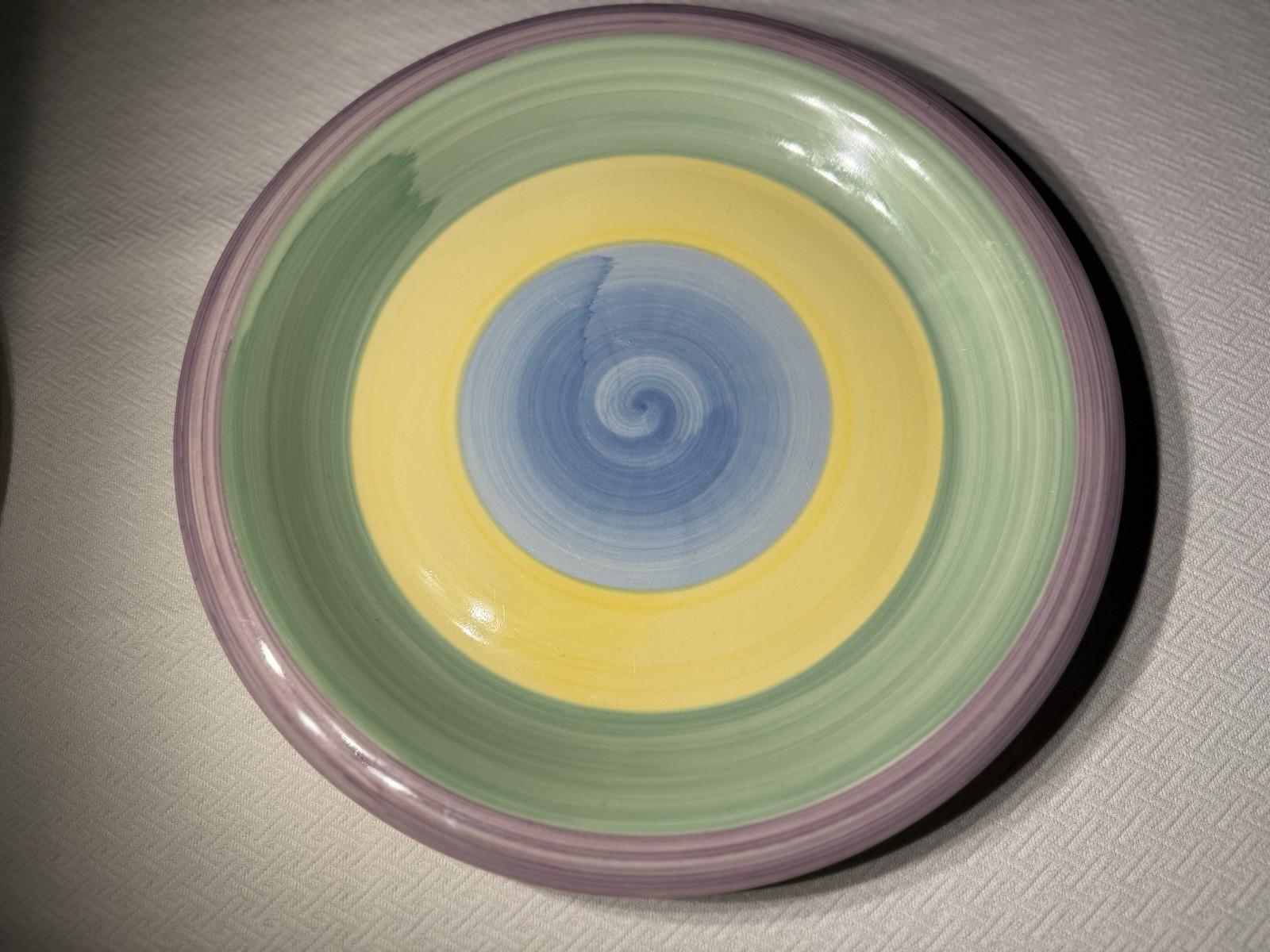 This five-piece stoneware set combines vintage Rainbow Collection dinner and salad plates with a coordinating Pier 1 bowl, creating a cheerful place setting for two.The plates feature the signature concentric rainbow design with bands of lavender, green, yellow, and blue that radiate from the center. The hand-brushed look of the glaze gives each plate a slightly organic character while still feeling bright and playful.Paired with them is a soft green Pier 1 bowl, which echoes the palette while grounding the set with a slightly more subtle tone. Together they create a balanced composition ideal for casual dining, brunch, or a colorful appetizer setting.Rather than listing the pieces individually, we paired the plates and bowl as a mix-and-match grouping for a whimsical and fun table setting and serving dish. Set includes• Two Rainbow Collection stoneware dinner plates – 10.5”• Two Rainbow Collection stoneware salad plates – 7.5”• One Pier 1 bowl – 6”The plates are marked Rainbow Collection Stoneware – Microwave & Dishwasher Safe.All pieces are in excellent vintage condition with minimal signs of prior gentle use of pre-owned stoneware. No chips or cracks observed.A bright and versatile addition to a colorful kitchen, eclectic table, or mix-and-match dinnerware collection.At Collectibles by A&D, we curate dinnerware the way a table is actually experienced — layering color, scale, and form so each piece enhances the next.📦 Shipping & PackagingShipping cost reflects the