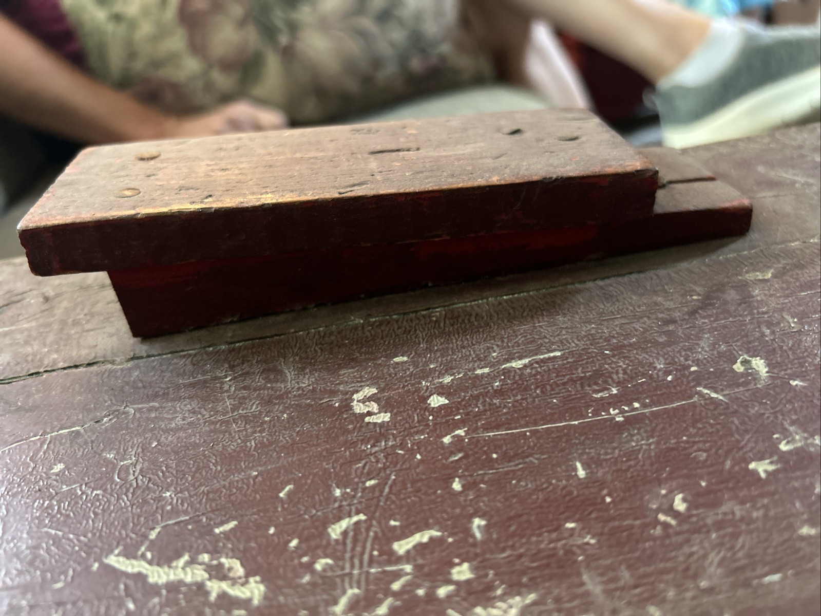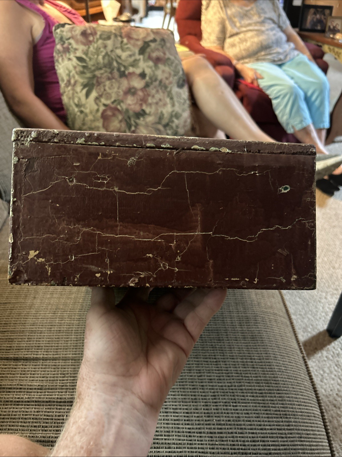 Has seen much use. Still sturdy and usable. Shown as found. Will benefit from a good cleaning. Brass hinges. Many layers of paint. Foot rest sturdy. This box just has a look. Please see pictures for details.