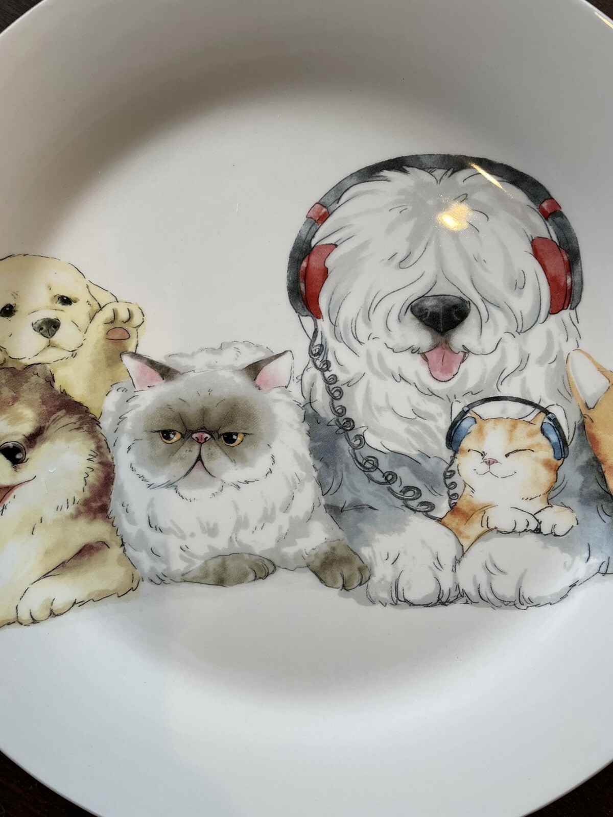 Vtg Pair Pier 1 Imports Ironstone 9" Plates Dogs Cats Huddled with Headphones Specs
