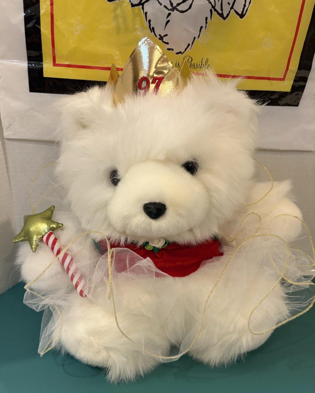 The product is a vintage 1997 Dayton Hudson Miss Santa Bear plush toy with a Sugar Plum Fairy character. This 13-inch bear comes with a gold star wand and a bag, and is made of plush material. It is part of the Santa Bear franchise and is designed for Christmas celebrations. This original collectible bear from the 1990s features a white bear with brown eyes, dressed in Christmas attire, making it a nostalgic addition to any holiday collection.