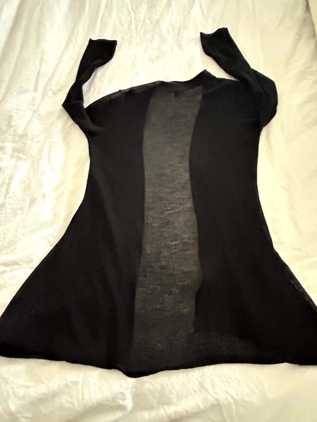 EILEEN FISHER BLACK LIGHTWEIGHT FLOWING WOOL CARDIGAN. PLEASE NOTE THAT THERE IS A SLIGHT SNAG UNDER THE LEFT SLEEVE. PLEASE SEE THE PHOTOS. NO STAINS. SIZE MEDIUM. THE BUST IS 38" APPROX WHEN CLOSED. 31" SHOULDER TO HEM. ( WITHOUT STRETCH)PL SEE MY OTHER LISTINGS AND FEEDBACKS TO BUY WITH CONFIDENCE. SMOKE FREE HOME.