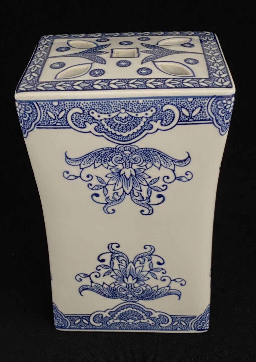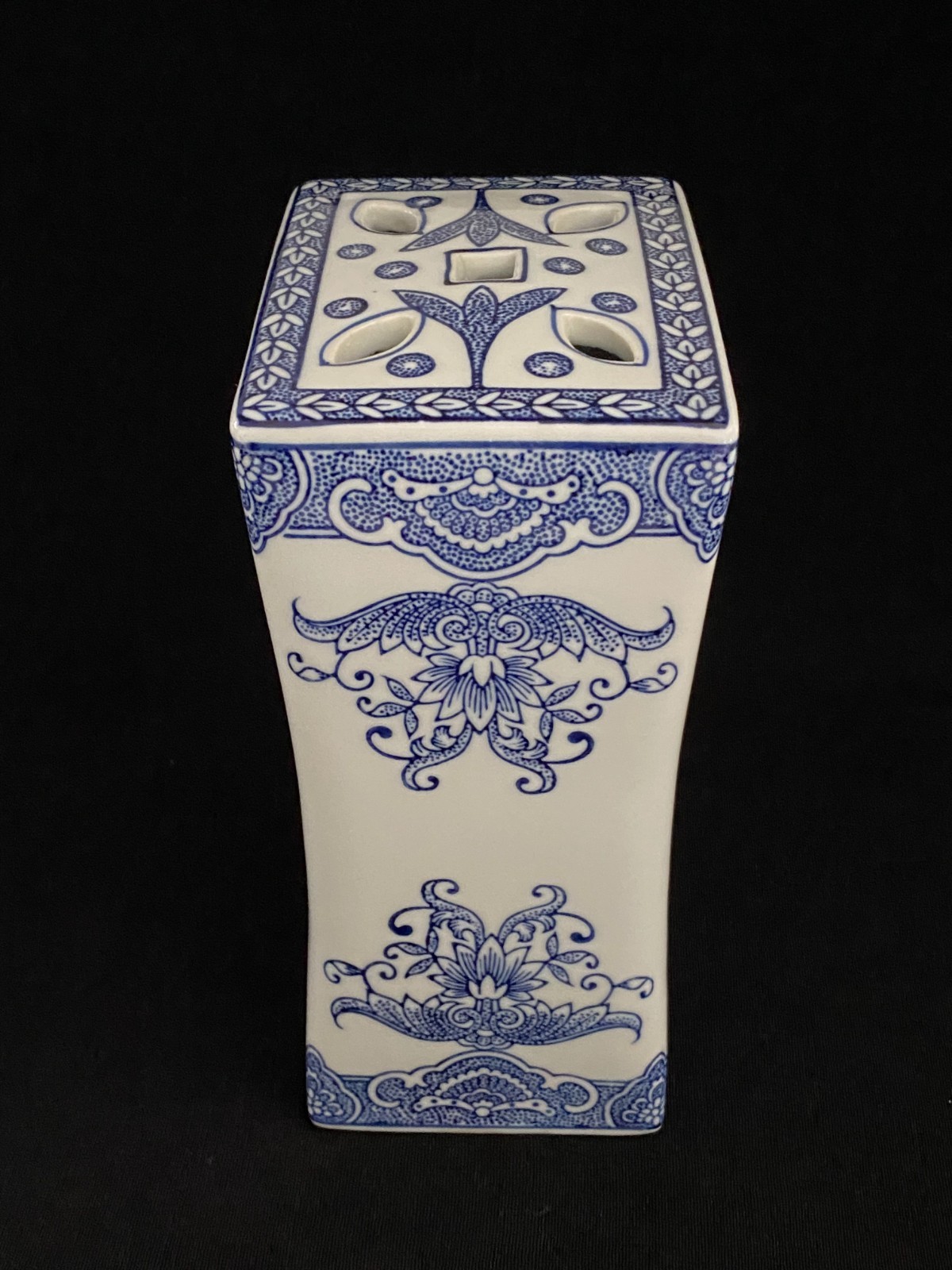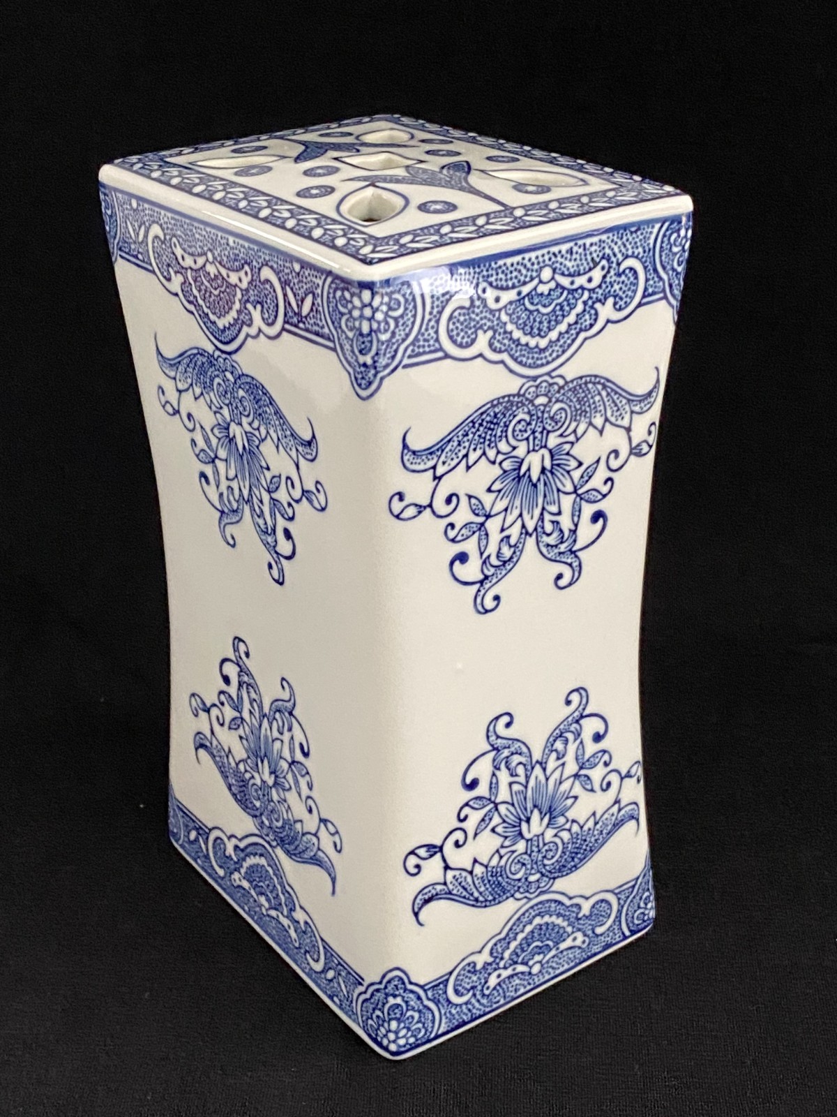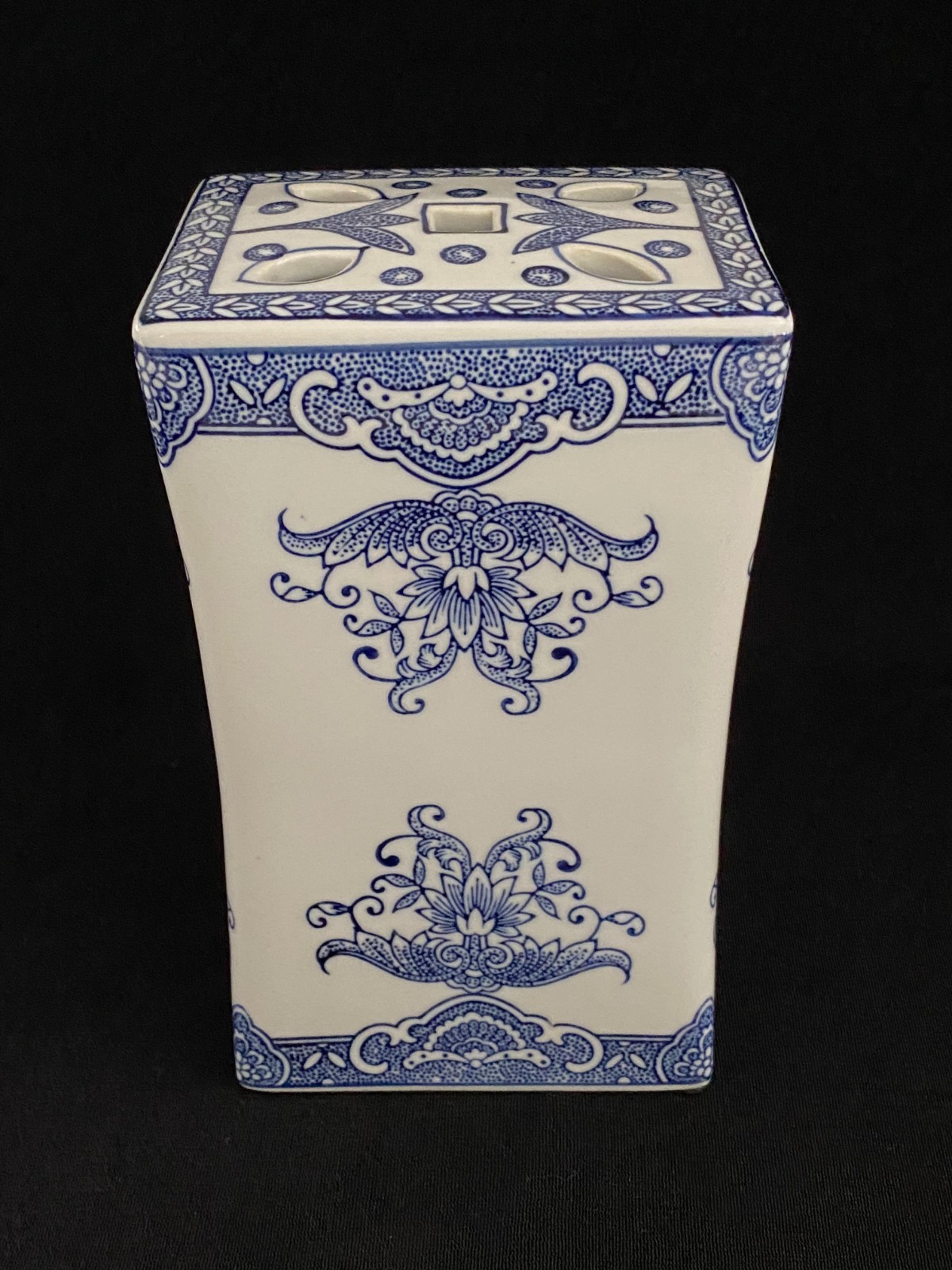 This listing is for a beautiful vintage blue and white chinoiserie flower frog vase with a lovely floral design on it. It is heavy and made of ceramic and measures 8" in height, about 4.75" - 5" wide, and about 3.5" deep. One of the narrow sides has a bump in the ceramic under the glaze, shown in the last photo, and one of the felt pads is missing from the bottom. It displays beautifully.Please view all photos prior to purchasing, as they are part of the description.**Item is sold in as is vintage condition. No returns.**25au0021