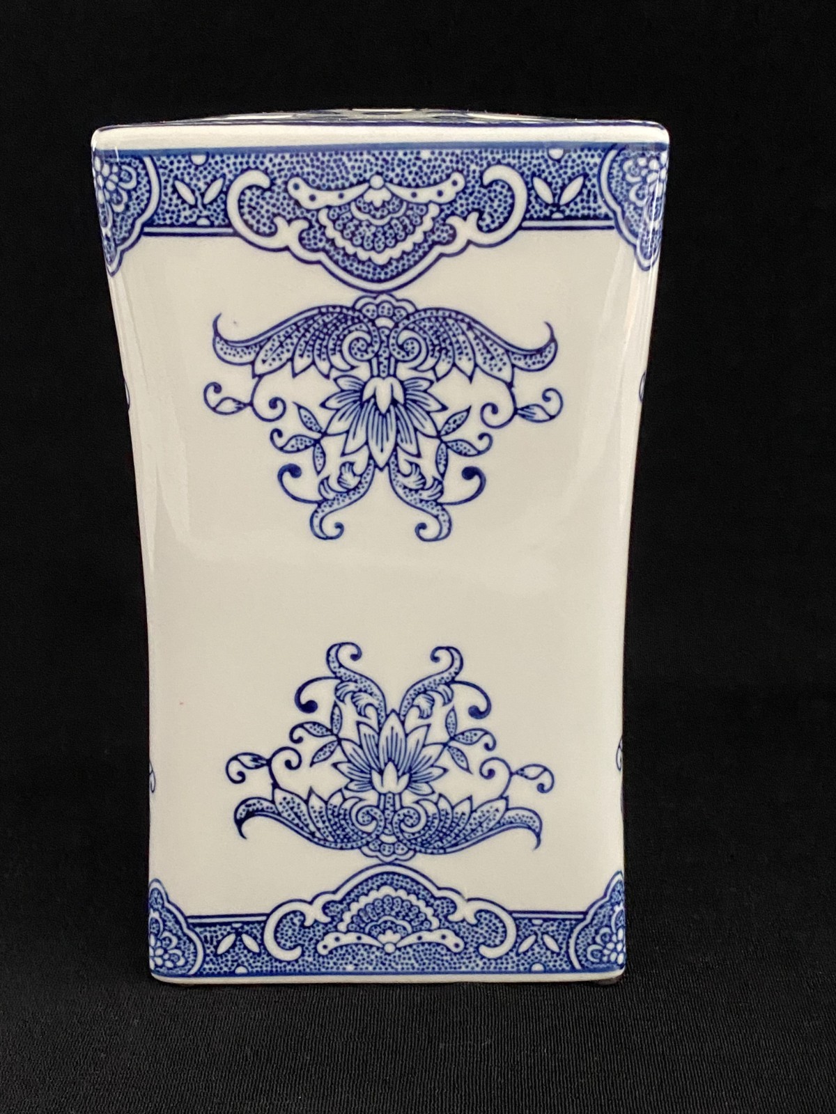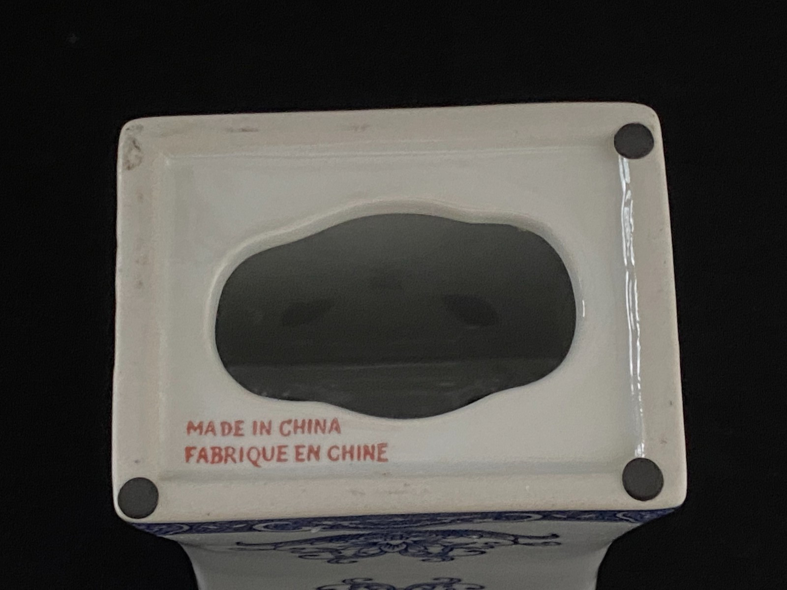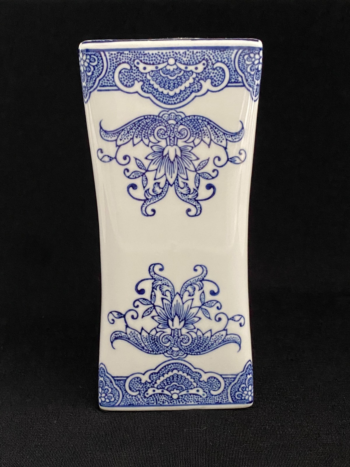 This listing is for a beautiful vintage blue and white chinoiserie flower frog vase with a lovely floral design on it. It is heavy and made of ceramic and measures 8" in height, about 4.75" - 5" wide, and about 3.5" deep. One of the narrow sides has a bump in the ceramic under the glaze, shown in the last photo, and one of the felt pads is missing from the bottom. It displays beautifully.Please view all photos prior to purchasing, as they are part of the description.**Item is sold in as is vintage condition. No returns.**25au0021