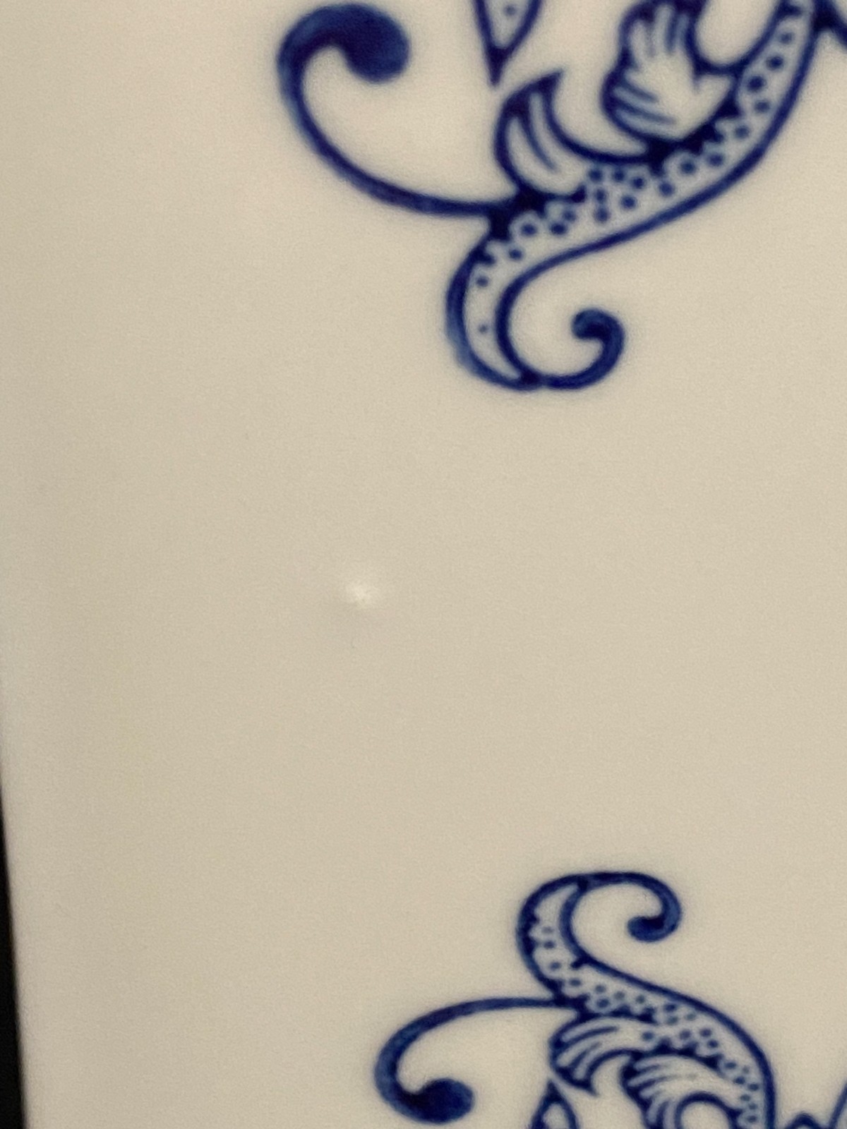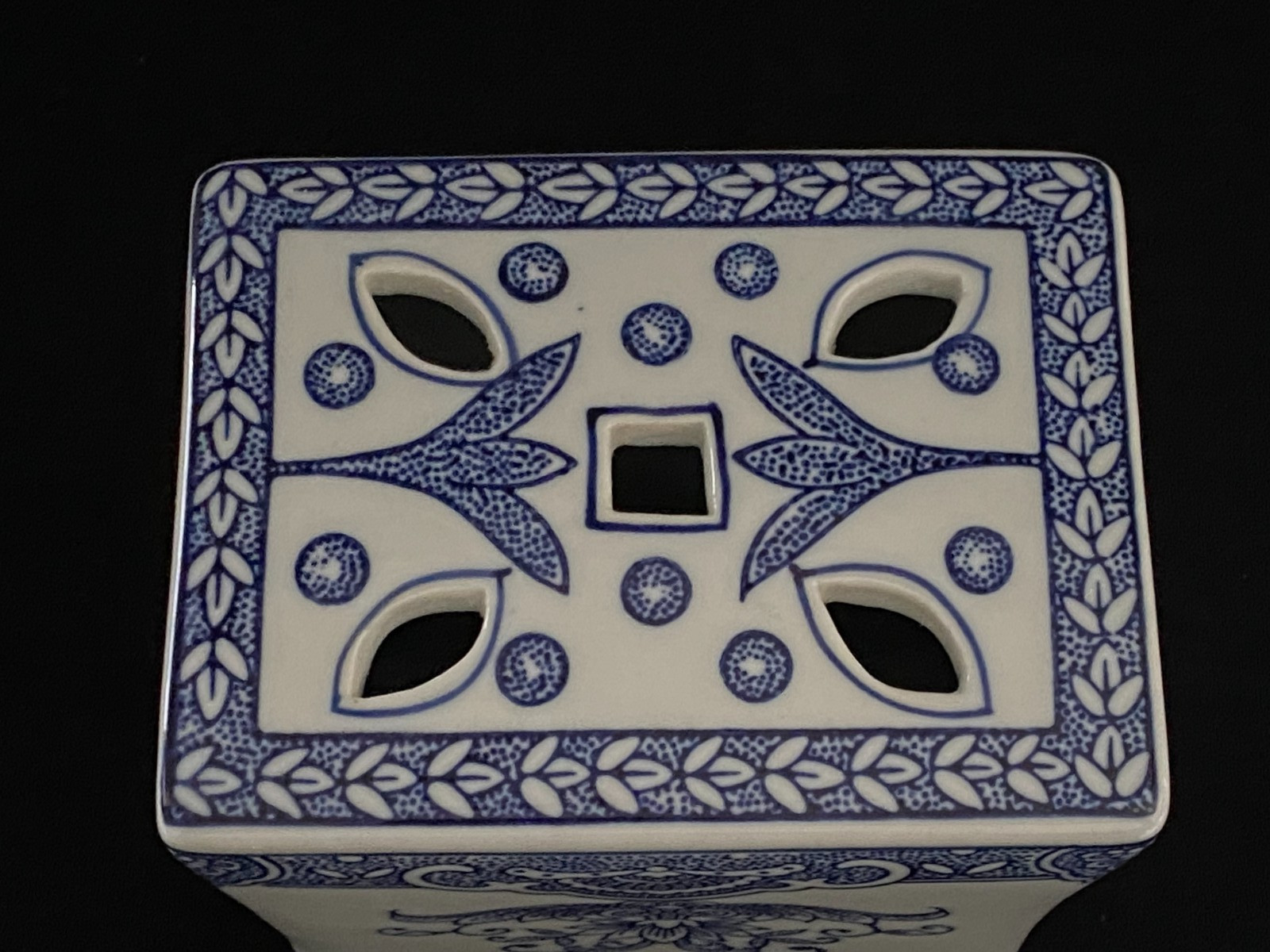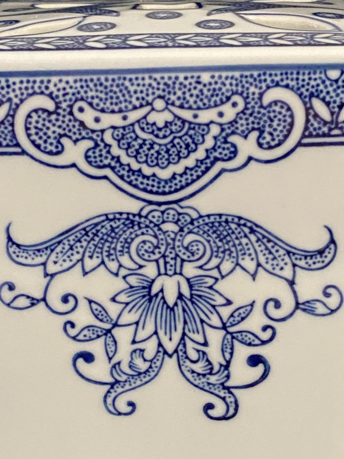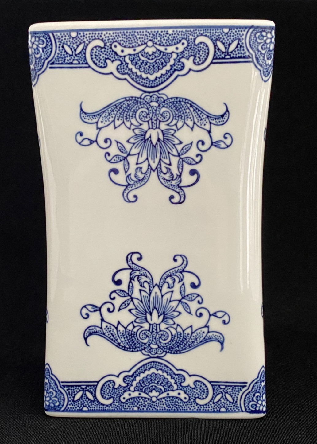 This listing is for a beautiful vintage blue and white chinoiserie flower frog vase with a lovely floral design on it. It is heavy and made of ceramic and measures 8" in height, about 4.75" - 5" wide, and about 3.5" deep. One of the narrow sides has a bump in the ceramic under the glaze, shown in the last photo, and one of the felt pads is missing from the bottom. It displays beautifully.Please view all photos prior to purchasing, as they are part of the description.**Item is sold in as is vintage condition. No returns.**25au0021
