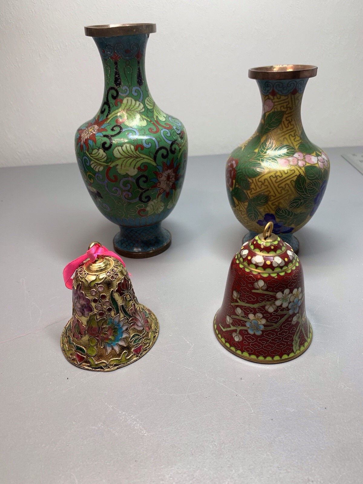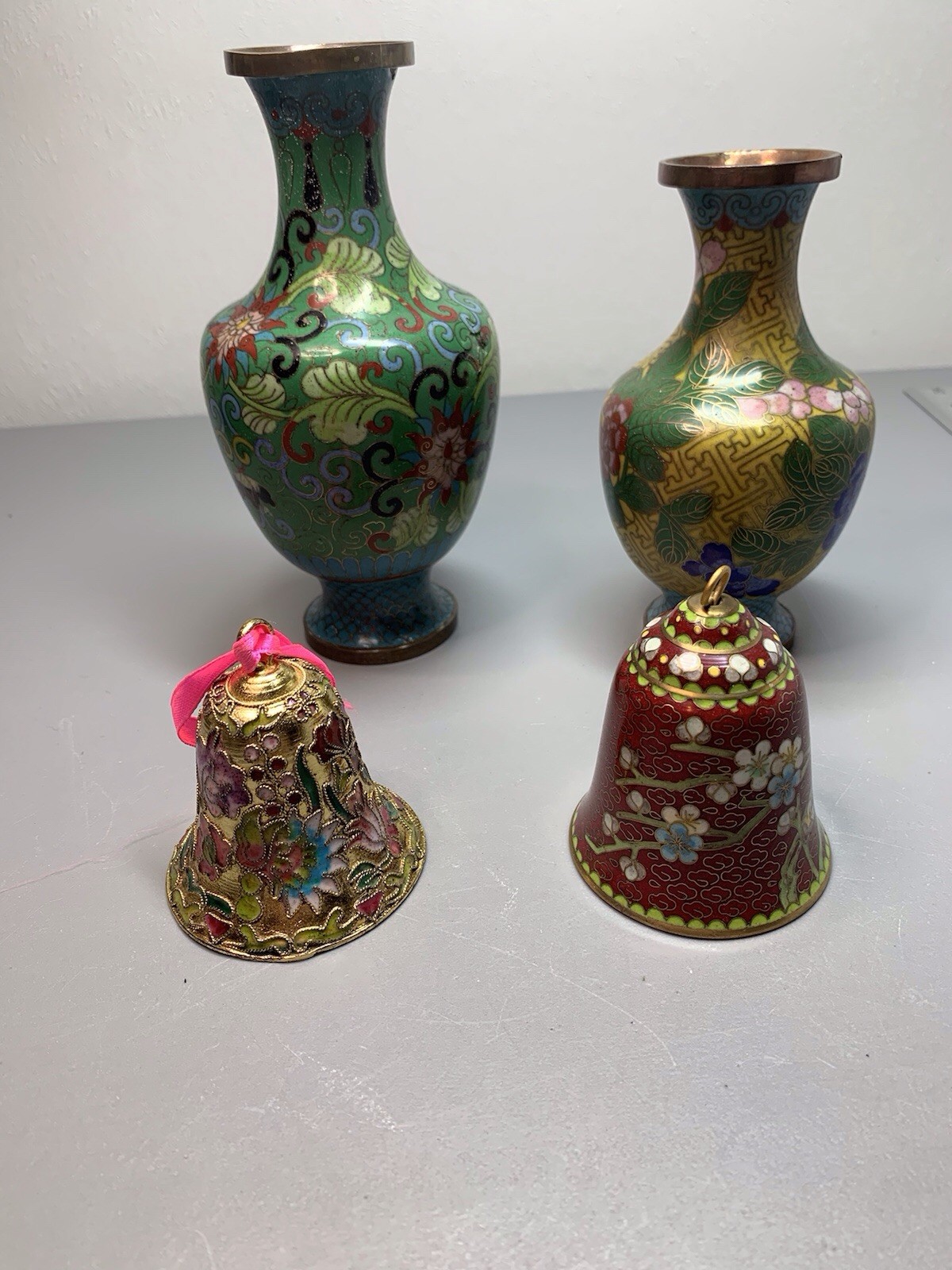 This used collectible set includes two cloisonne brass glass enameled vases plus two matching bells. The pieces feature colorful enamel decoration suitable for display, gifting, or adding to a vintage-inspired collection. Condition is listed as used; check the listing for details on wear, size, and any marks or imperfections. Free shipping is included with the purchase, and the item will be shipped as described in the listing.