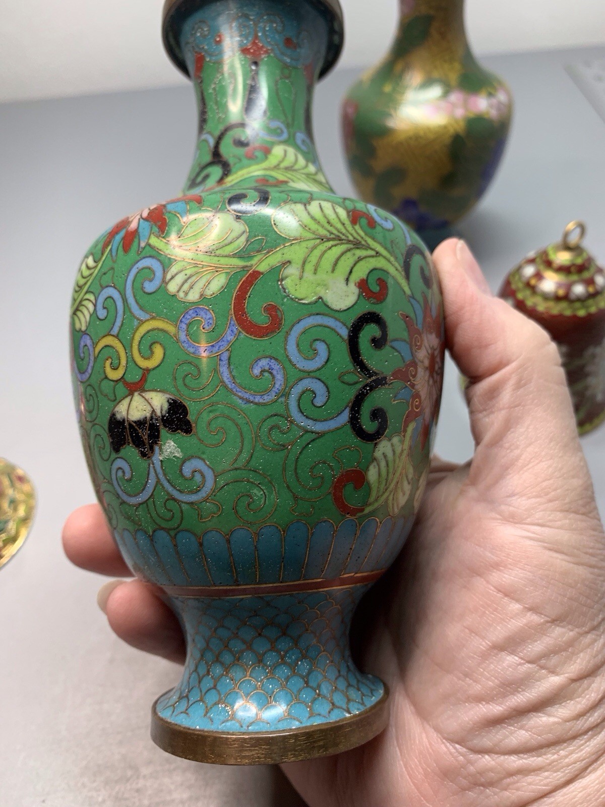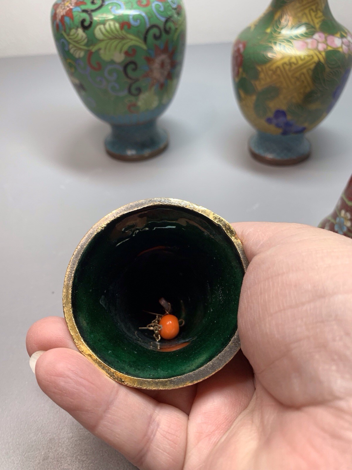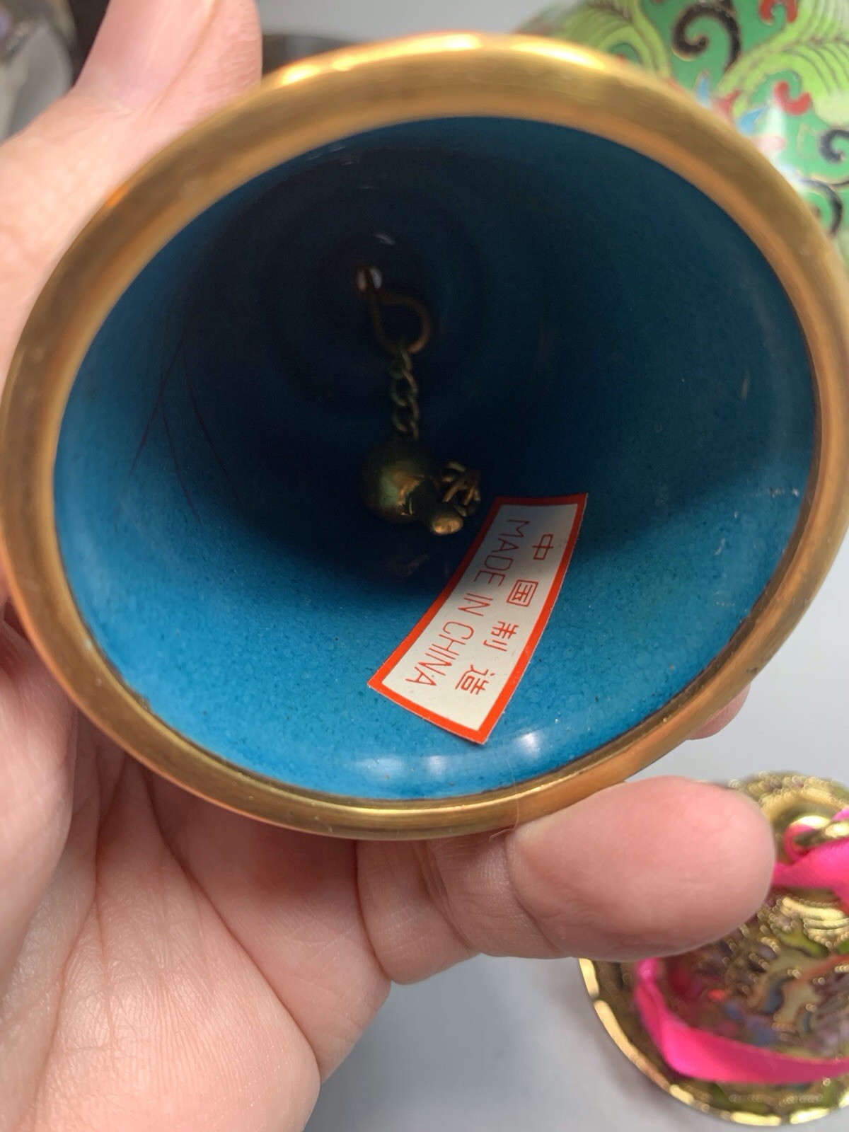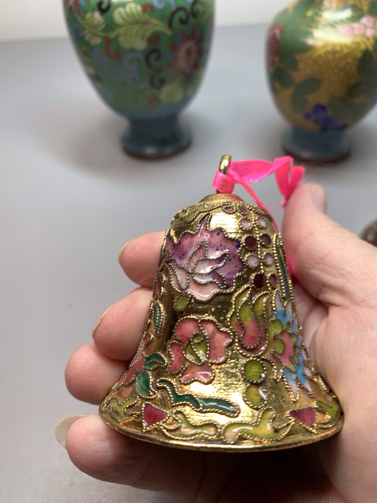 Cloisonne Brass Glass Enameled Vase Set of 2 with Bells, Collectible