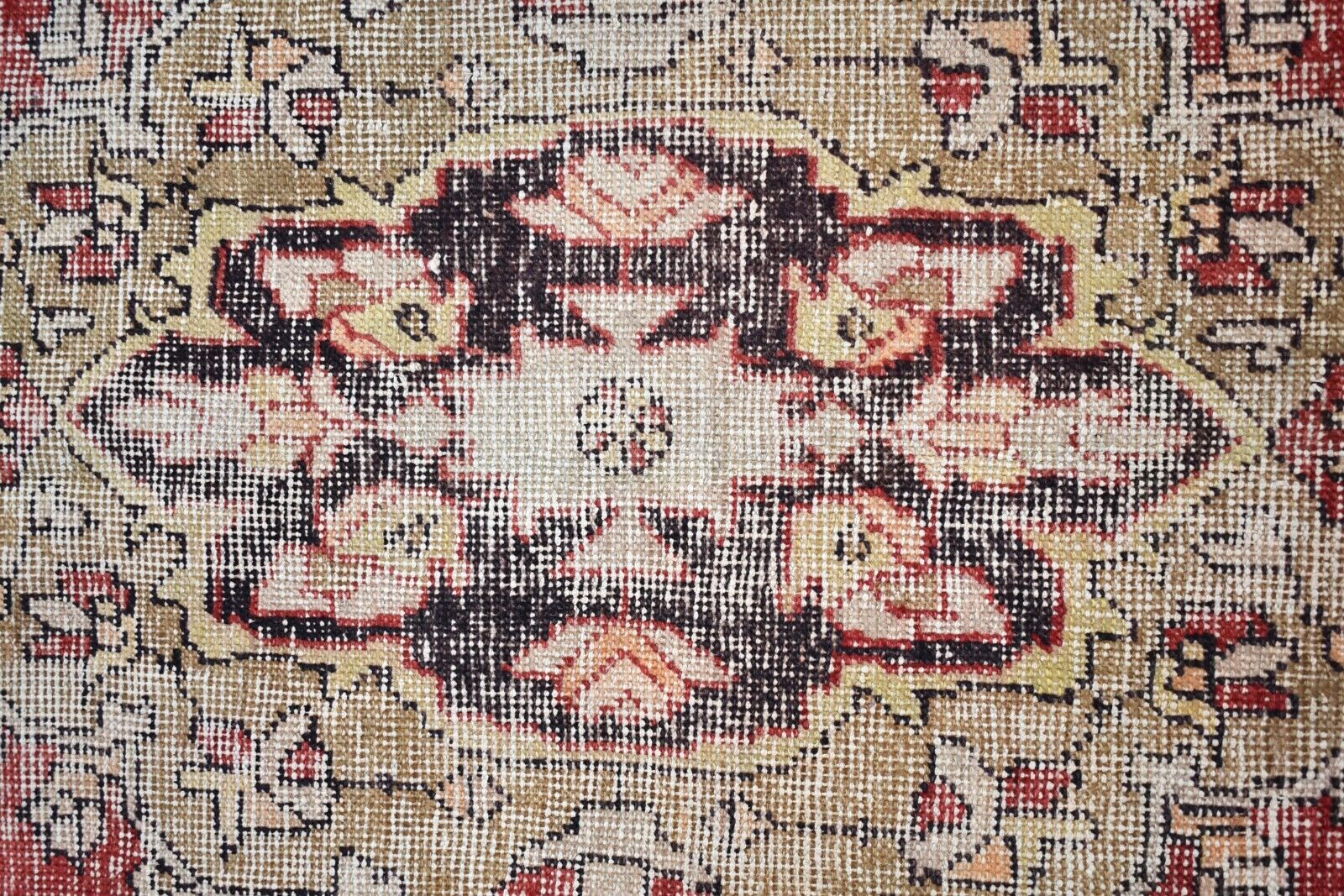 This vintage Turkish rug measures 40'' x 73'' with a muted dye and low pile, making it suitable for various rooms like bedrooms, living rooms, and kitchens. Hand-knotted from 100% wool in a rectangle shape, this rug features a bordered pattern with a multicolored design typical of Turkish culture. The rug's vintage retro style from the 1950s adds a unique touch to any space, while its eco-friendly and noise-reducing features make it a practical and stylish addition to your home decor.Rug ID & 4297Origin & TurkishType & Area Rug Size feet & 3'4'' x 6'1'' ftSize inches & 40'' x 73'' inches Size cm & 102 CM x 186 CM
