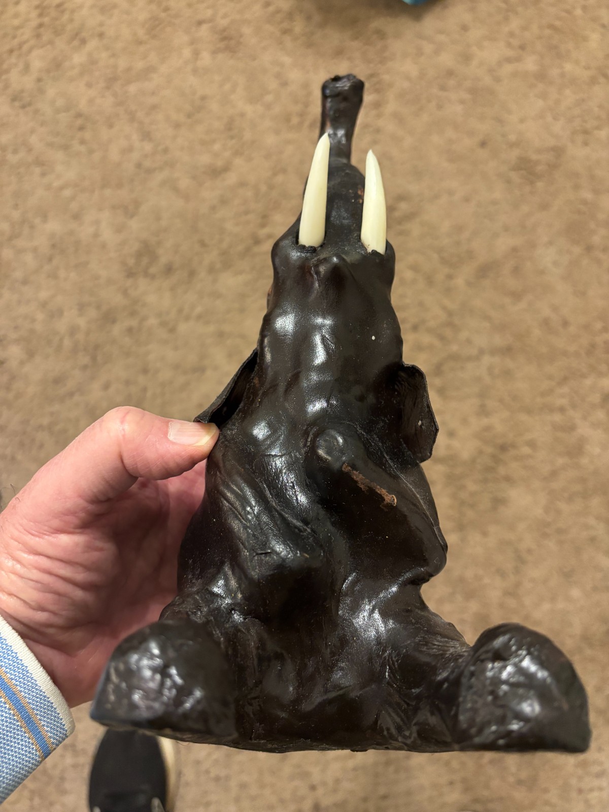 This vintage large elephant leather-wrapped sculpture is a unique collectible decor piece featuring an upturned “lucky trunk” design. It is pre-owned, meticulously cared for, and previously stored in a glassed curio cabinet away from light and other damaging elements, so it remains in very good condition. Measurements, materials, and any maker details are not confirmed here—check the listing for details. Free shipping is included with purchase, and the item will be packaged carefully for safe delivery.