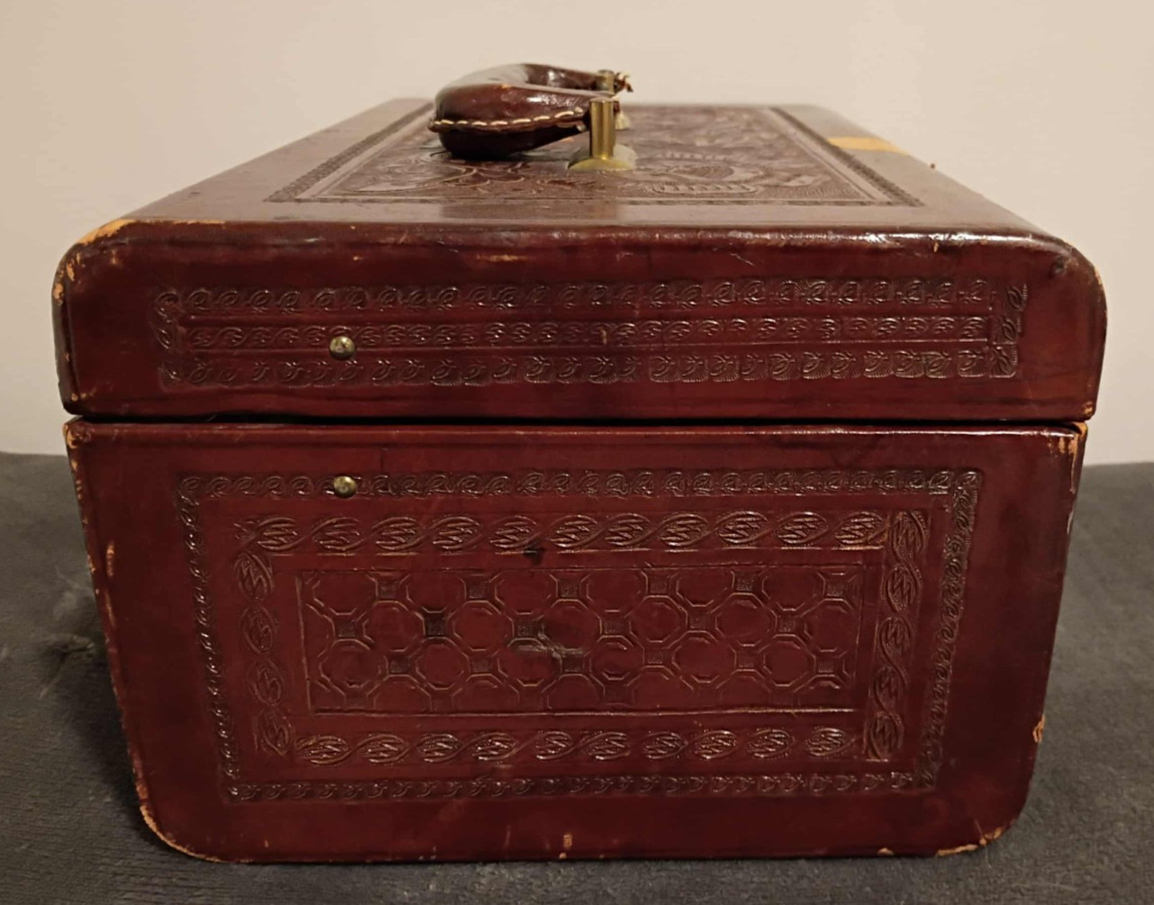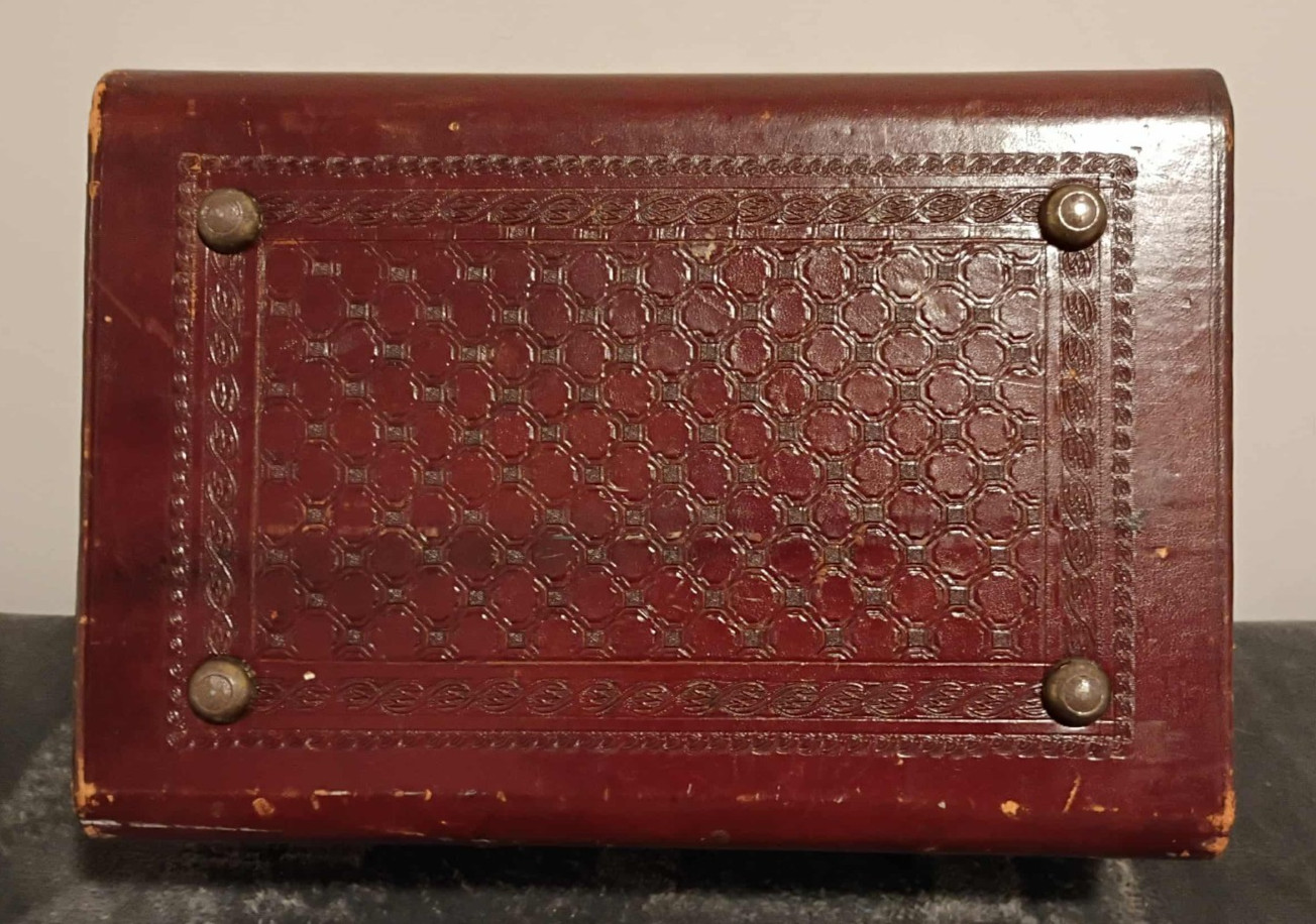This pre-owned Artmex vintage hand tooled train cosmetic case is a practical travel beauty case for organizing makeup, toiletries, or small accessories. The exterior features a tooled leather look with wood construction and brass-tone hardware, and it includes 2 keys as shown in the listing. Expect normal signs of prior use such as minor scuffs or wear consistent with age; check the listing for details on exact condition and any included inserts or compartments. Free shipping is included, and the item will be packed carefully for transit.