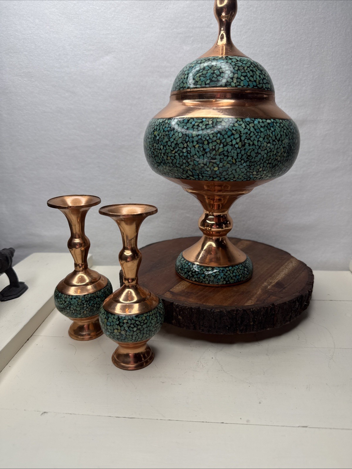 This product is a beautiful hand-made Persian decorative piece adorned with turquoise stones, crafted from copper. Originating from the Middle East, specifically Afghanistan, this item showcases intricate detailing and vibrant colors typical of Islamic art. The post-1940 creation adds a touch of modern craftsmanship to this traditional and culturally-rich piece, making it a unique and eye-catching addition to any collection of Middle Eastern antiques. With matching vases.