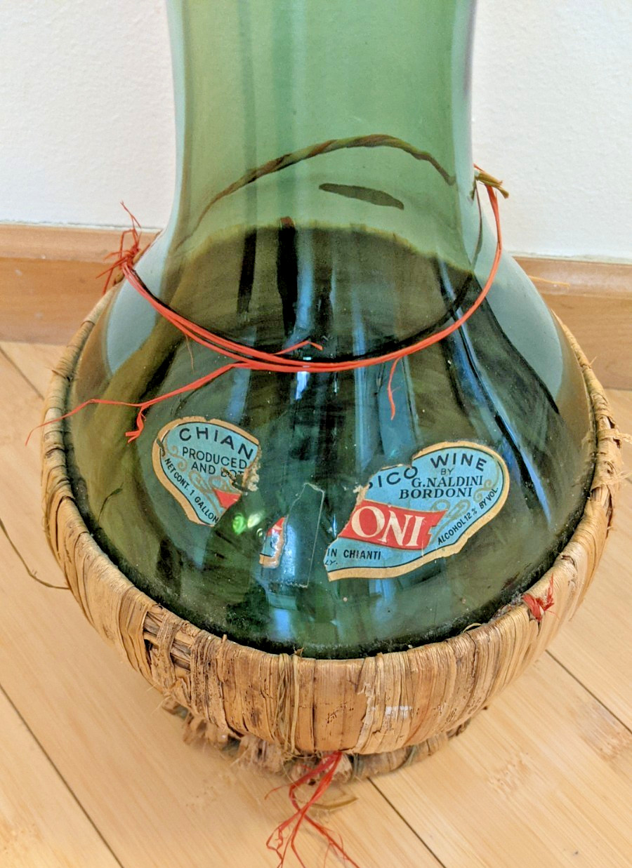 Vintage 46" MCM Italy 1960s Empoli 1 Gallon Green Glass Chianti Wine BottleTHIS BOTTLE IS EMPTYScarce and RareWine Brand: G. Naldini BordoniWine Type: Chianti WineMade In: ItalyBottle Manfufacturer: Probably Empoli or Murano ItalianCase Covering: Basketweave wicker basket wrap - it does have some wearSize Capacity: 1 GallonSize: 7" Diameter and 46" TallDistributer: Probably Romano Brothers, Chicago, Illinois (based on the stickers)