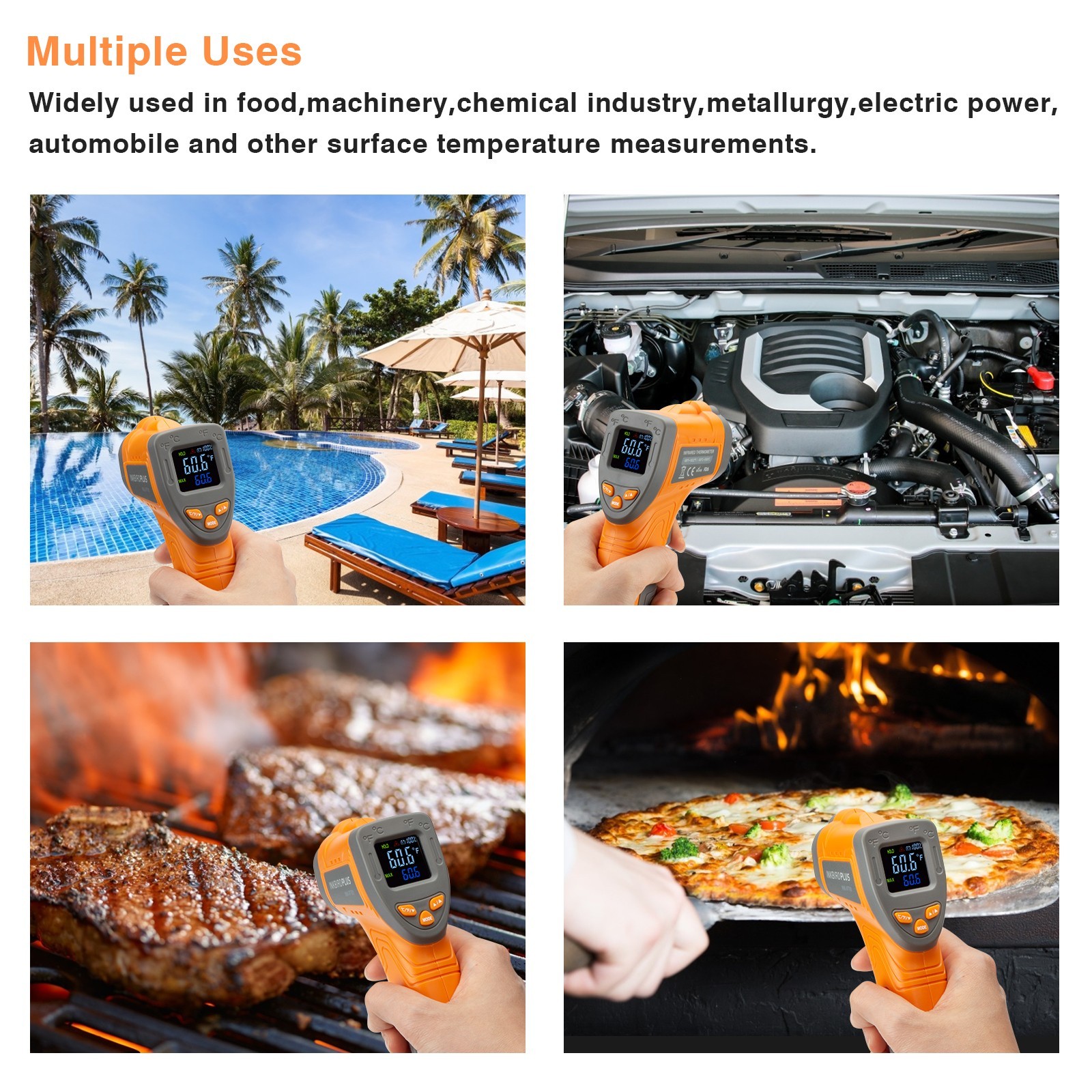 ==========================================================================================================Note: Package Content Includes Infrared Thermometer Gun + RTH-11K Meat Thermometer==========================================================================================================Infrared Laser Thermometer Gun (INKBIRD INK-IFT01)NOT FOR HUMANPlease note:Practical for both indoor and outdoor use, the Laser grip 1080 lets you safely measure surface temperatures from a distance while still maintaining laser-sharp accuracy.Measure extreme temperatures ranging from -58°F (-50°C) to 1112°F (600°C) without ever needing to come in contact.Use the infrared temperature gun for a high range of applications, from internal electronic components to oven temperatures.With user-friendly operation and a temperature measurement range.Warning: This IR temperature gun is for use on surfaces, NOT for humans. This laser temperature gun can not measure the internal temperature of an object; Do not irradiate human eyes directly or indirectly with infrared rays at any timeEasy to Measure the surface temperature of inaccessible objects e.g. for cooking, pizza oven thermometer, temperature gun for reptiles or foodBetter Accuracy: 12:1 distance spot ratio, accurately measure targets at greater distances; The best distance betweenthe laser thermometer gun and object of measurement should approximately be 14.17 in (36cm)Convenience Design: This IR infrared thermometer gun has a