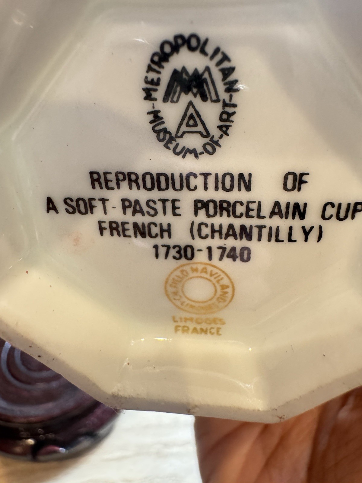 Description:Up for sale is a beautiful vintage porcelain cup from one of the most prestigious collaborations in ceramic history: Haviland & Co. of Limoges, France, producing official reproductions for The Metropolitan Museum of Art, New York.🏺 About This Piece:· Manufacturer: Certified Haviland & Co., Limoges, France—legendary porcelain makers since 1842, suppliers to royalty and the White House .· Provenance: Official reproduction produced for and sold by The Metropolitan Museum of Art, based on an 18th-century Chantilly porcelain original from the museum's own collection .· Design: Elegant Chantilly style, with delicate form and classic French porcelain aesthetics.· Era: Mid-to-late 20th century vintage (likely 1950s–1980s).· Includes: The cup and a separate display stand.📏 Exact Measurements:Piece DimensionsCup Height: 2.4"Stand Height: 1.2"Condition:The cup and stand are in excellent vintage condition, with no chips or cracks. The porcelain is bright and clean, and the decoration is crisp. Please see photos for details.Markings:The underside bears the official Metropolitan Museum of Art backstamp and the Haviland Limoges certification mark—proof of its authentic, museum-authorized origin.📦 Shipping:Will be carefully packed to ensure safe delivery.---A Note to the Buyer:This isn't just a cup—it's a piece of museum history, made by one of France's greatest porcelain houses for one of the world's greatest museums. Whether you collect Haviland, love French porcelain, or simply appreciate beautiful objects, this cup brings a touch of the Met into your home.Please view all photos as they are part of the description. Feel free to message with any questions. Thanks for looking!