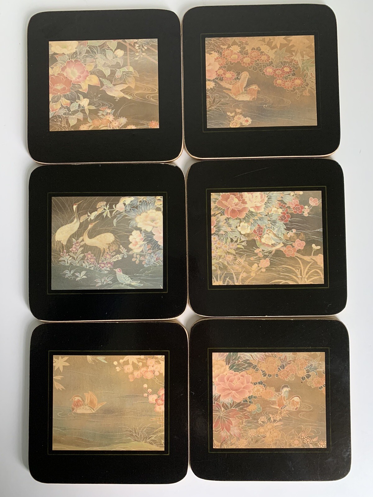 Vintage Clover Leaf Coaster SetMade in United KingdomBeautiful set of six hardboard coasters featuring an Asian-inspired floral and bird design. Cork backing helps protect surfaces. Includes original box.📏 Size: Approx. 4.25” square📍 Brand: Clover Leaf🇬🇧 Made in the UK🛑 Condition: Vintage used condition — edges show light wear consistent with age. Box has wear. See photos.Perfect for cottagecore, traditional decor, tea service, or replacing missing Clover Leaf mats.