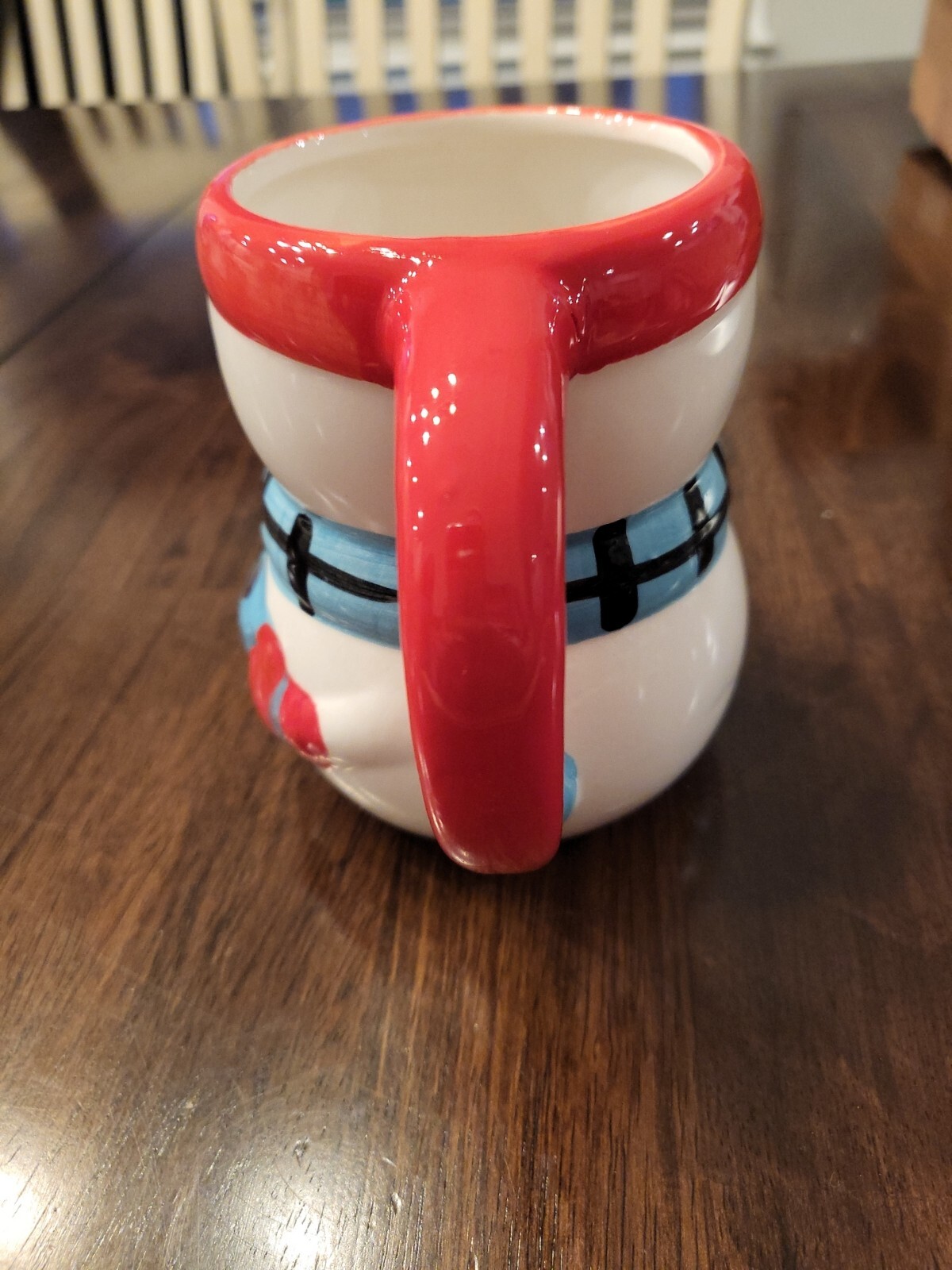 size with a red handle and blue scarf around the cup. The snowman character is depicted on the mug, making it a great addition to any snowman theme collection. The coffee mug/cup set includes one cup and is handmade in China. It is recommended to hand wash only for care instructions. This unisex adult mug features a handle and is not personalized. It is an ideal option for collectors or those who love to add unique mugs to their dinnerware and serveware collection.