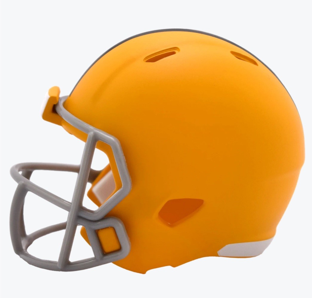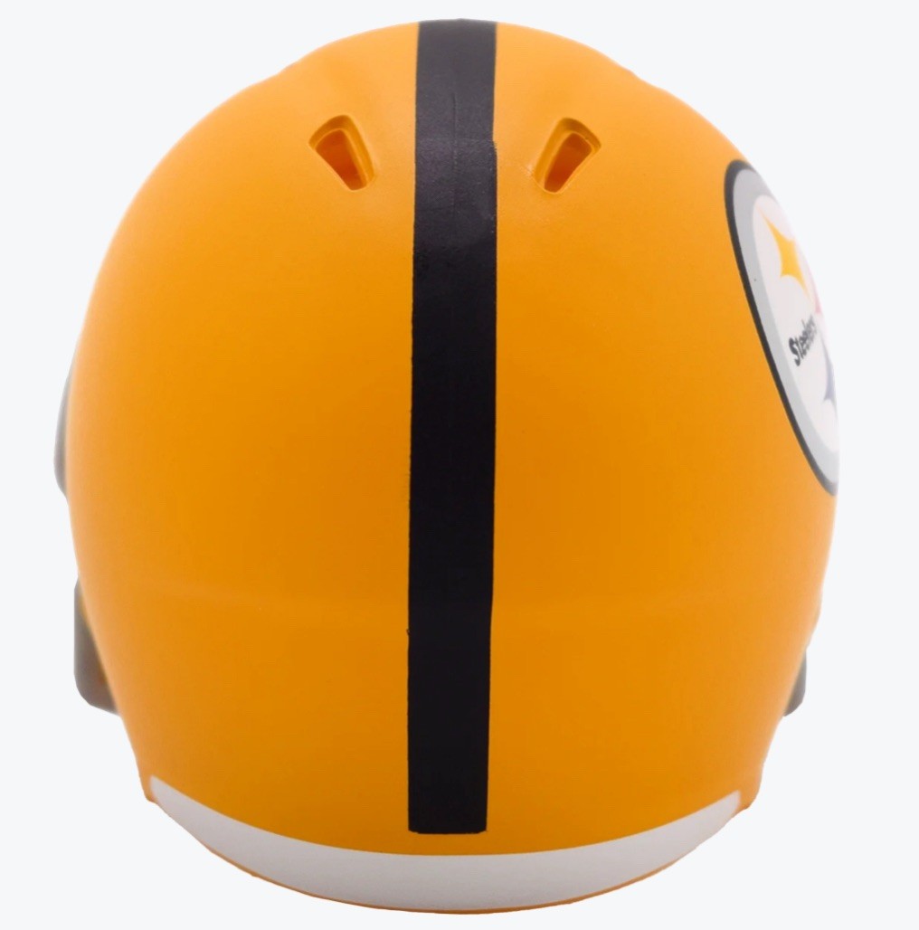 The Pittsburgh Steelers 2025 On-Field Alternate Limited Edition Pocket Size Helmet features a flat Green Bay gold shell, grey facemask, Steelers logos and a black center stripe. Introduced in the 2025 season, this alternate helmet made its on-field debut for the first time ever this year.Features:• Official team decoration• Interior foam padding• Limited edition gold holographic insert• Approximately 2” tall