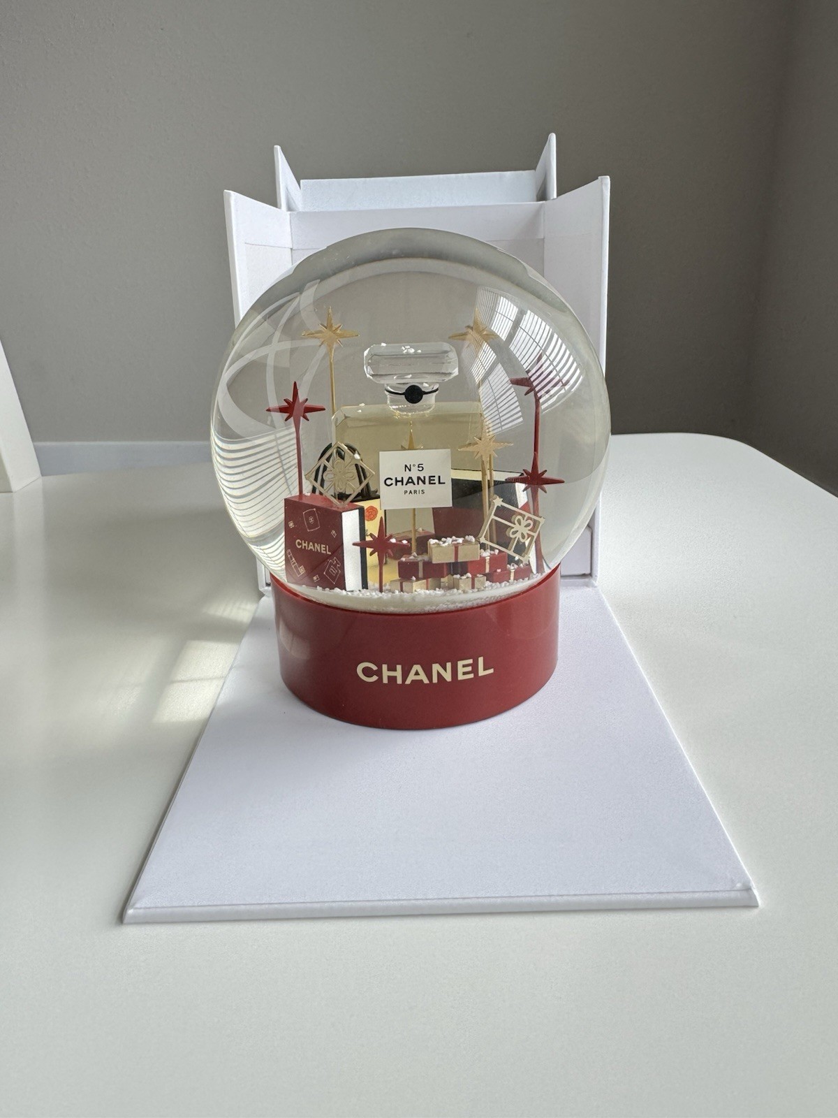 Elegant snow globe with a red base. Features Chanel branding and gold accents. Perfect for holiday decor.Elevate your collection with this authentic Chanel N°5 Holiday Snow Globe, a limited edition boutique/VIP exclusive not available for retail purchase. These collectible globes are given only to Chanel clients and beauty insiders, making them one of the most sought-after holiday décor and display pieces from the house of Chanel.This edition features the iconic Chanel N°5 bottle, holiday gift boxes, golden stars, and snow inside a crystal-clear globe with a red base stamped CHANEL in gold lettering.