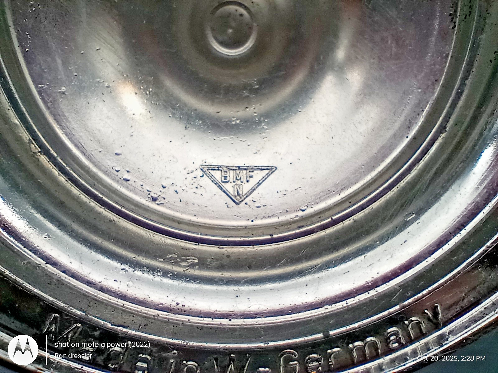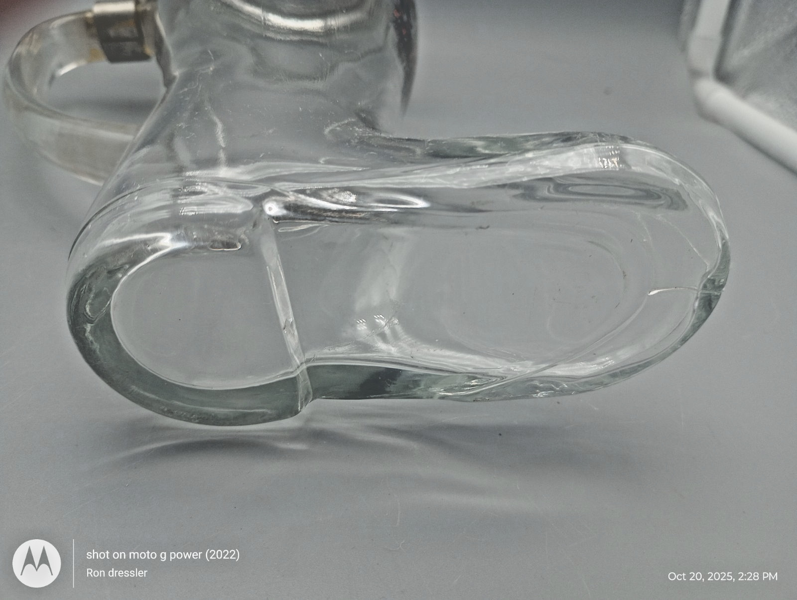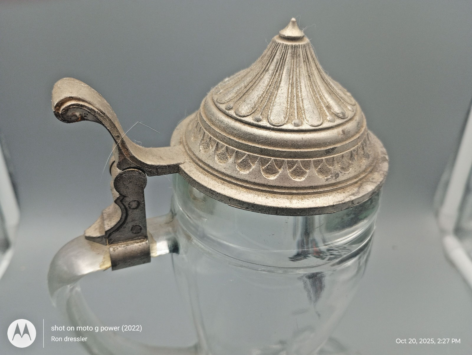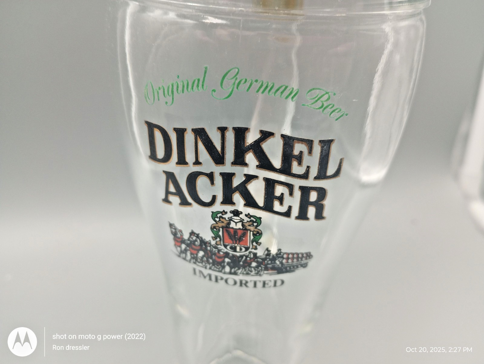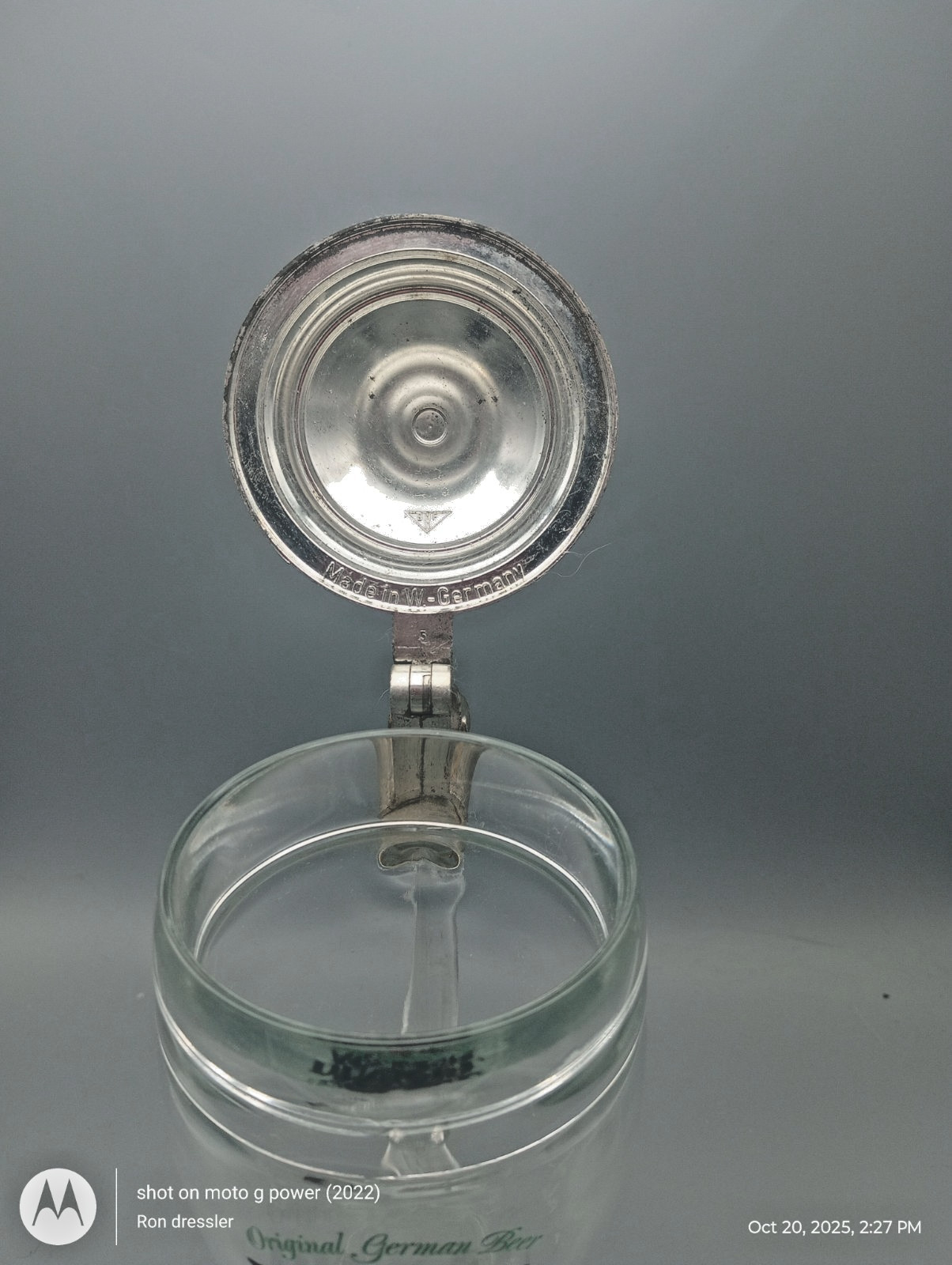 Brand & Brewery: Dinkelacker (Stuttgart, Germany).Manufacturer: BMF (Bayerische Metallwarenfabrik), originally made in West Germany.Material: Heavy, thick clear glass with a solid, hinged pewter lid.Design: Features the iconic Dinkelacker logo; some versions may also include relief scenes on the glass or lid.Dimensions: Approximately 9.5 inches tall.Estimated Capacity: At 9.5", this typically holds 1 Liter (approx. 33–34 oz).Excellent vintage condition. Glass is clear with no chips, cracks, or flea bites. The pewter lid is securely attached, and the hinge functions smoothly. Minor age-related patina on the pewterThe "trick" to drinking from a boot is to point the toe to the left or right to avoid an "air pocket" splash—though with the pewter lid