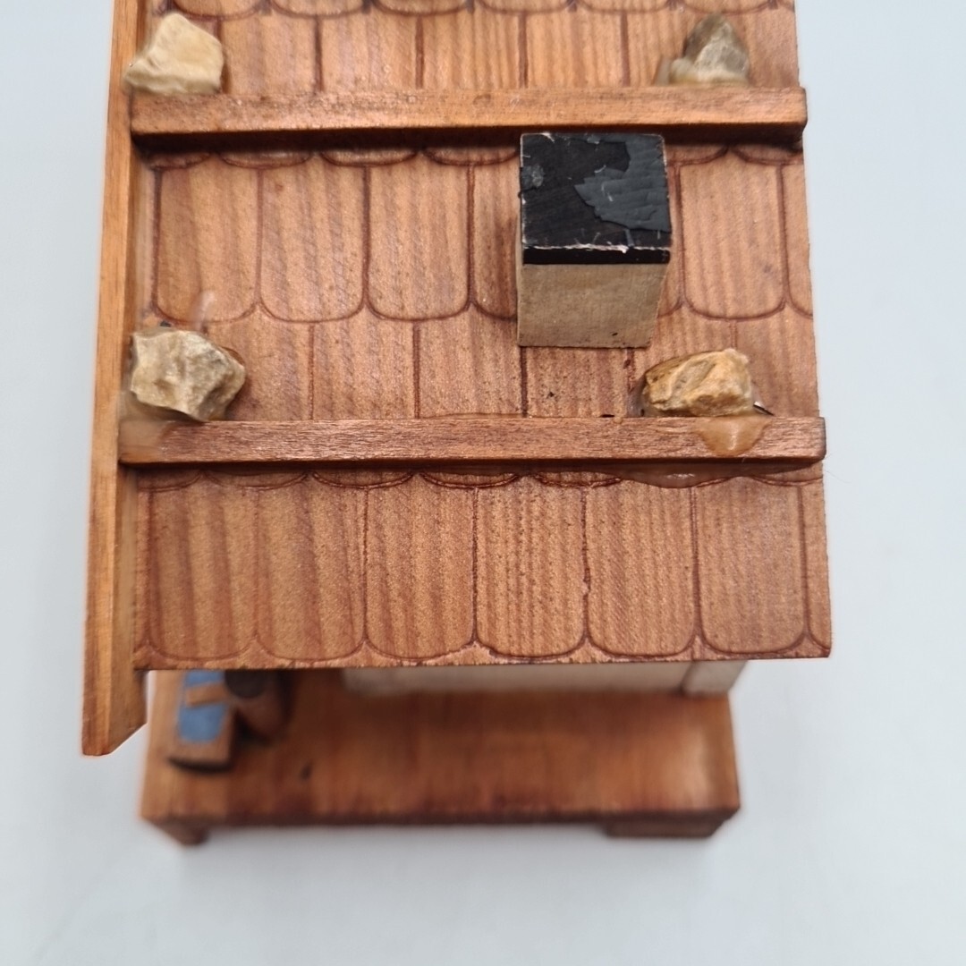 Please note the music box is working as is the wooden toggle on the side to stop it but it is old and fragile and hard to know if it's in original working condition as such. The people move if you turn the wooden turret on the roof but again hard to determine if it's in original working condition. The wood is in good clean condition no damage some minor marks, wear and tear chips and dings from age. Please see the photos for the condition Selling as is. 14cm long 7cm wide 9cm tall