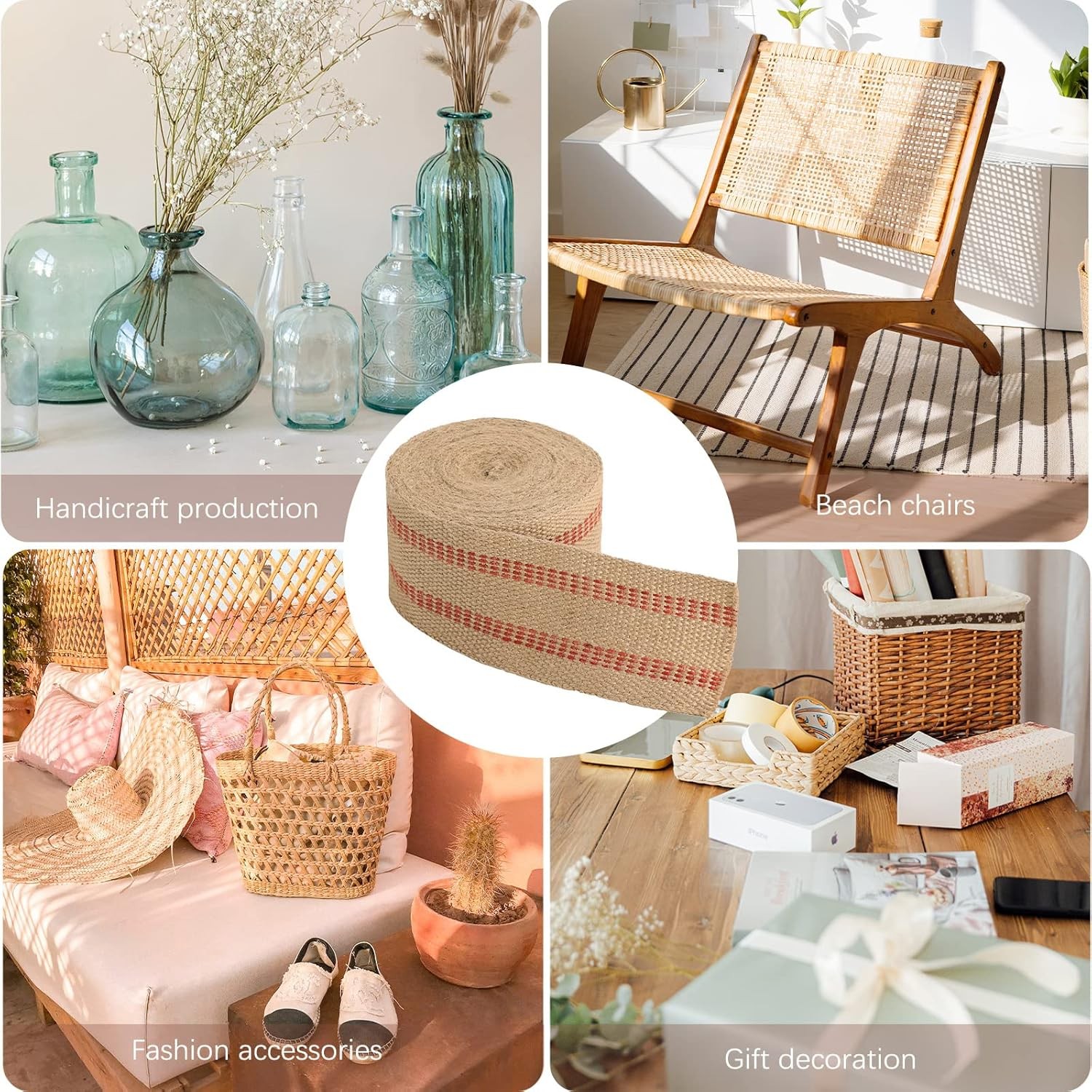 Product Description Perfect for Crafting: Red stripes running through the burlap chair webbing add whimsy and chic elegance while maintaining a classic beauty. Material: Burlap Fabric Color: Red and Brown Size: 3.5" x 10 Yd Thickness: 0.2mm YaeCCC Craft Jute Webbing Tape, 3.5" x 10 Yd Rolls 11 lbs Thickness 0.2mm Red jute webbing is made with with all-natural jute fibers, used heavily in commercial furniture upholstery for its strength, appeal and renewability. Fabirc material is 100% nature linen. Pure natural environment, no static electricity, anti-aging, durable. Heavy duty and strong for Crafts & Decorations All kinds of luggage belt handles, upholstery webbing, fashion belts, fashion