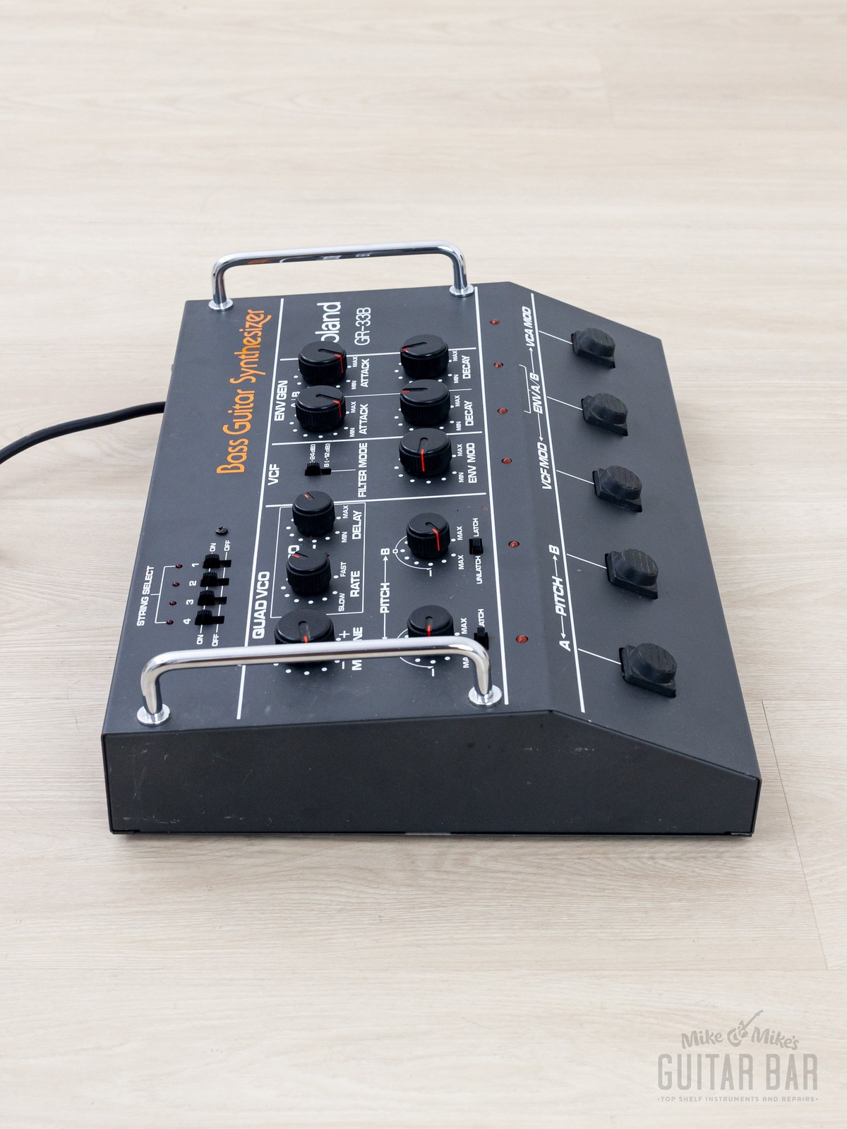 Up for sale, a 1980 Roland G-33 Bass Synthesizer Controller and GR-33B Synthesizer in near-mint, 100% original condition and in perfect working order, complete with the original 24-pin cable and hardshell case. Produced at the Fujigen factory in Japan, the G-33 was a bass variant of Roland’s pioneering GR-300 Guitar Synth. A decidedly unique, versatile tool that can produce a fast array of tones, the GR-33B has been used by artists as diverse as Béla Fleck, Haruomi Hosono, and Michael Anthony.Tonewoods on the G-33 controller include a maple neck (set-neck construction), ash body, and slab rosewood fretboard, weighing 9lbs 7oz. The PU-144S single coil pickup is warm and round, yielding plenty of low end heft without sacrificing treble detail and articulation, resulting in an almost acoustic/standup-like tone. Of course the star of the show are the myriad sounds achievable via the combination of the G-33 and the GR-33B. This G-33 has been professionally setup here at Mike & Mike’s Guitar Bar with 45-100 roundwound strings, comfortable action, and accurate intonation. Neck Specs:Wood: Maple (three-piece)Shape: Medium C, measuring ” 1st fret, 1.015” 12th fretFretboard: Rosewood, dot inlayFrets: Medium jumbo, no wearScale Length: 34”Nut: 1.650” (42mm), boneTuners: Clover buttonSerialization: K80-prefix translates to November, 1980 build dateBody Specs:Wood: AshPickups: PU-144S single coil x1, Divided pickup (for use with GR-33B)Controls: Bass Volume, Bass Tone, Bass/Synth Balance, VCF Cutoff, VCF Resonance, VCO/VCO+Dist/Dist three-way mini-toggle, LFO Depth knob, LFO Touch PadsHardware: High-mass brass bridgePlastics: Sure Grip-style knobsGR-300 Specs:Up to 4-voice polyphony2 oscillators per voiceVCOs are directly harmonically locked to each string, but can be tuned separatelyVCF (voltage controlled filter, low pass), 2 modes: -12 and -24 dB per octave, with envelope modulation (attack and decay)Low Frequency Oscillator with Lag (Delay) GeneratorBuilt-in footswitches controls the VCO/VCF Modulation, VCO harmonize pitch (detuning of the VCOs), and PresetsPedal control input for the VCFSynchronized, flashing LED status indicatorsDimensions: 15.75" (W) 11.125" (D) 4" (H)The gloss “Robert” Brown finish exhibits some minor dings on the body, and the neck profile is smooth and clean. The GR-33B synth is very clean, with pristine graphics and virtually no wear on the enclosure.The original black tolex hardshell case for the synth is included, along with the original 24-pin cable, and a gigbag for the bass controller.