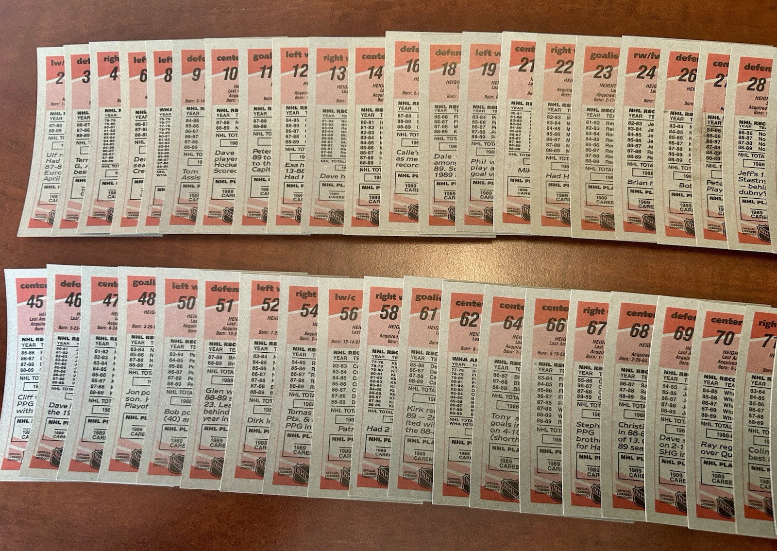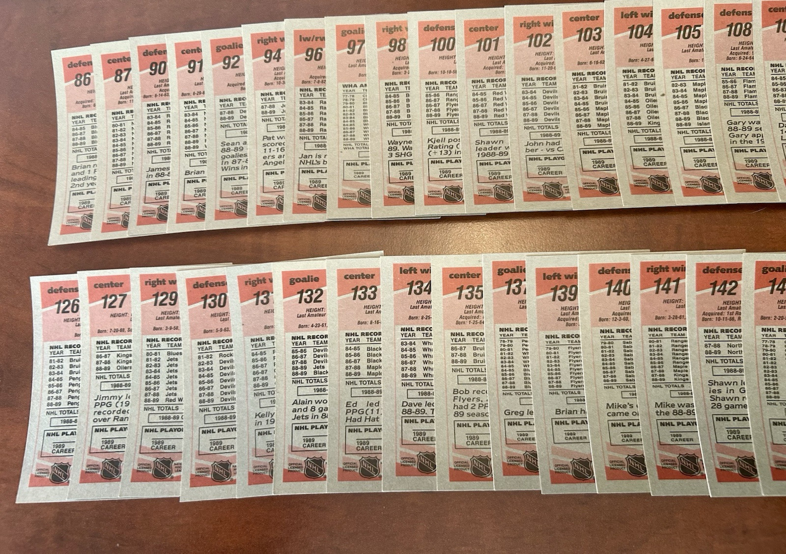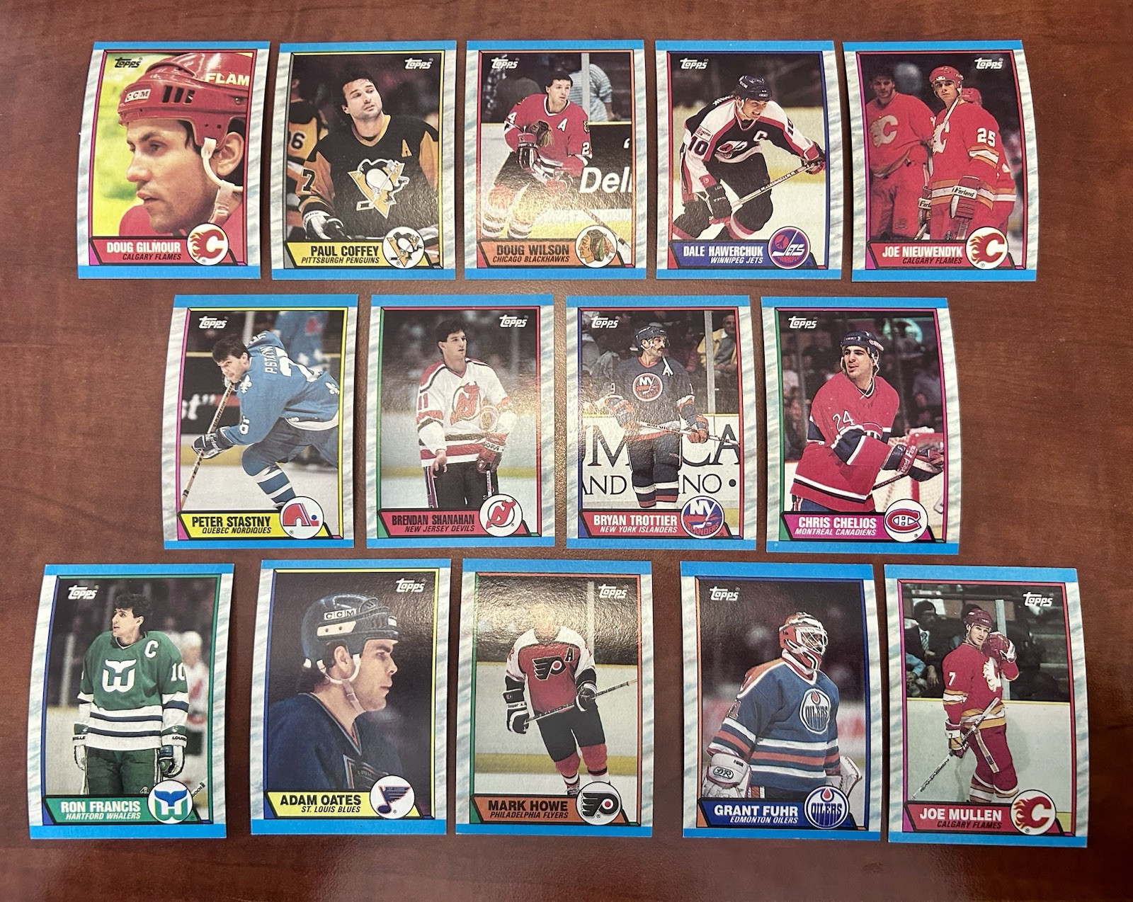 This used 1989/90 Topps NHL hockey card lot includes 175 cards with Hall of Famers and no duplicates. Condition is listed as used, with notes indicating EX to EX/MT overall; individual card condition may vary. A good option for set building, player collecting, or adding vintage Topps NHL cards to your collection. Free shipping is included. Check the listing for details on the exact player list (e.g., Kurri, Savard), included inserts, and any specific wear such as corner softness, centering, or surface marks.