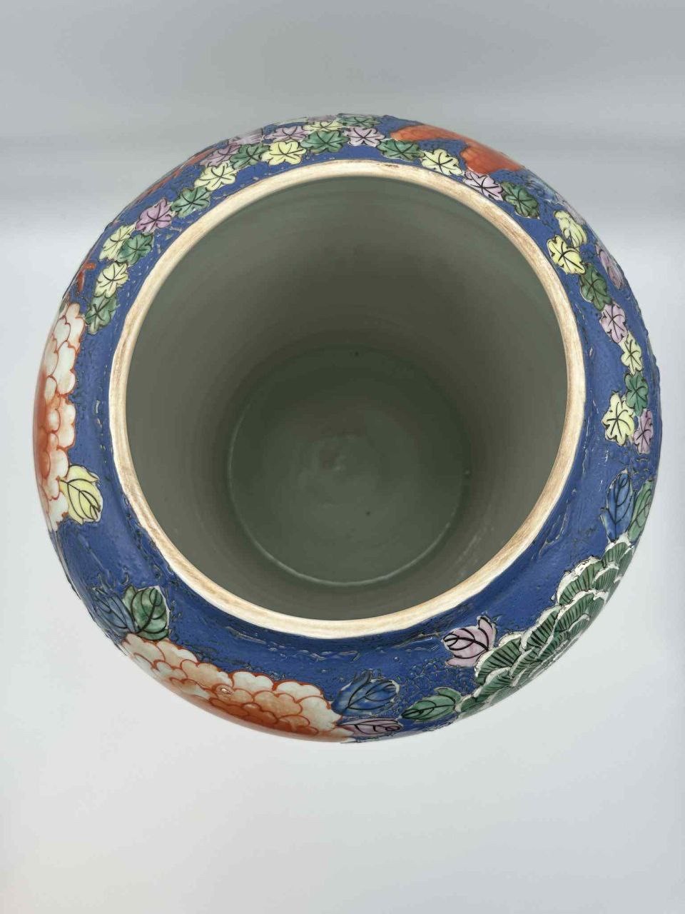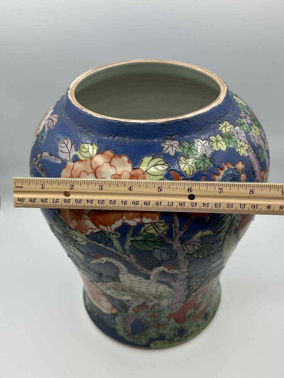 Beautiful vintage Chinese porcelain vase featuring an intricate hand-painted design with phoenix, cranes, peonies, and floral motifs on a deep cobalt-blue background. The vase has a textured, raised surface and vibrant enamel colors typical of late 20th-century Chinese decorative porcelain.The bottom bears a red seal mark, common for factory-made Chinese pieces from this period.This is a striking statement piece — perfect for Asian-style décor, display shelves, or collectors of Chinese ceramics.Condition:Overall very good vintage condition. No chips or cracks visible. Minor wear from age and handling. Please see photos for details.MeasurementsHeight: 13 inWidth (widest part): 10 inMouth opening: approx. 6.5 in