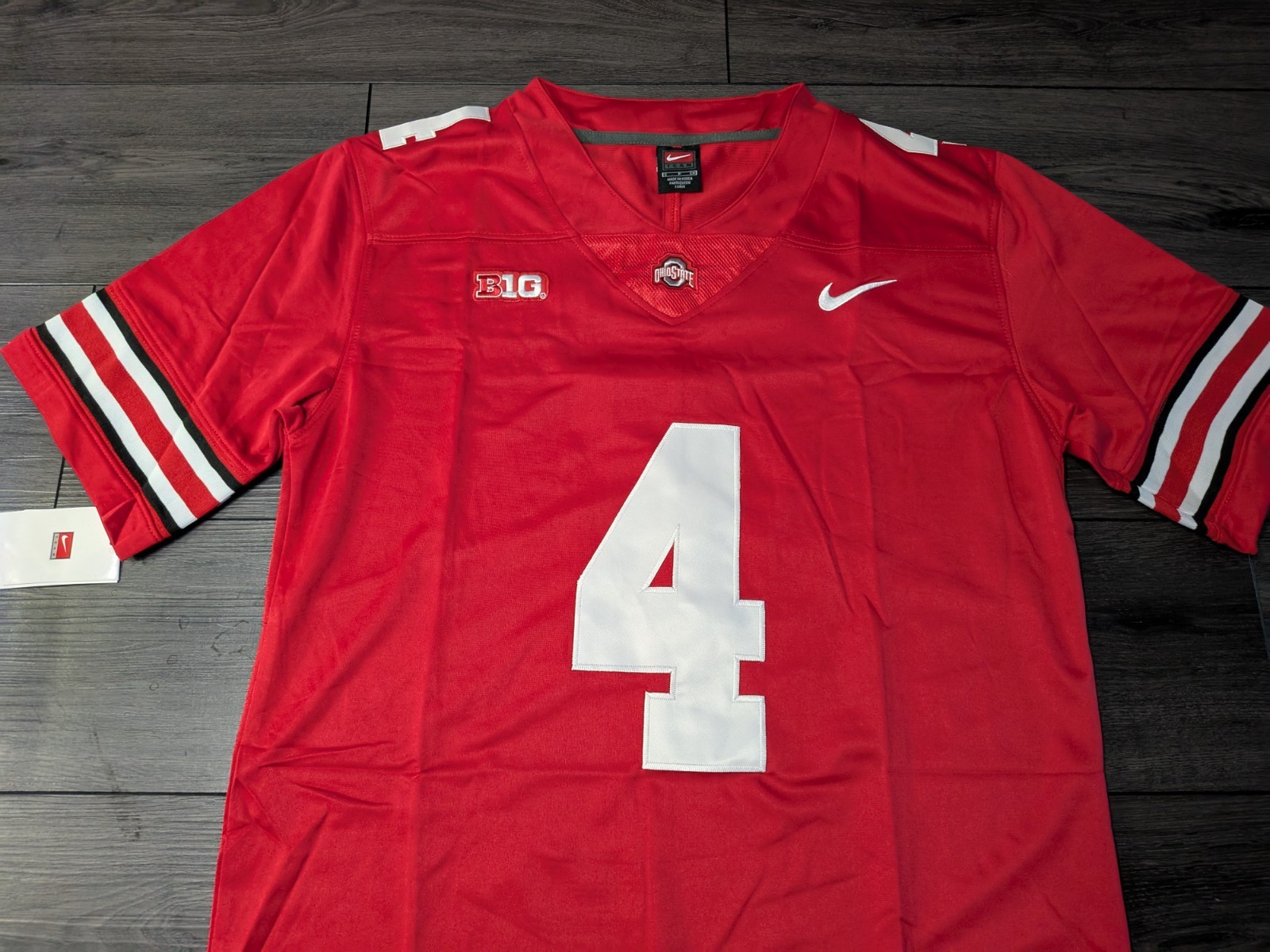 This Jeremiah Smith #4 Ohio State Buckeyes stitched football jersey is offered in new condition and is suitable for fans, collectors, or game-day wear. The listing highlights a scarlet red Buckeyes-style jersey with stitched numbering and name details. Free shipping is included with the purchase, helping you know your total cost upfront. Check the listing for details on sizing, materials, and any included tags or packaging, as these specifics are not provided here.