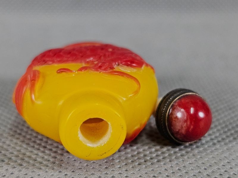 Small Chinese Kylin Deer Carved Peking Overlay Glass Snuff Bottle