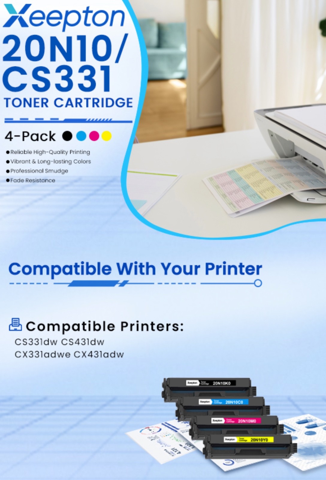 CS331 CX331 Toner Cartridge Replacement for Lexmark 20N10 20N10K0 20N10C0 20N10M0 20N10Y0 Toner Cartridge for CS331dw CS431dw CX331adwe CX431adw Printer Ink, 20N10 4-Color Combo PackBrandXeeptonColorBlack Cyan Magenta YellowIncluded ComponentsToner CartridgeCompatible DevicesCompatible for Lexmark CS331 CX331 CS431 CX431 CS331dw CS431dw CX331adwe CX431adw PrinterCompatibility OptionsCompatibleSpecial FeatureAdvanced Ink Formula for Enhanced Print QualityCompatible Printers: Xeepton 20N10 Toner Cartridge Works with Lexmark CS331dw CS431dw CX331adwe CX431adw PrinterPackage Contents: 1 X CS331 black 20N10K0, 1 X CS331 cyan 20N10C0, 1 X CS331 magenta 20N10M0, 1 X CS331 yellow 20N10Y0, total 4 Compatible CX331 Toner CartridgesPage Yield: Up to 1,800 pages per 20N10K0 black toner cartridge, 1,800 pages per