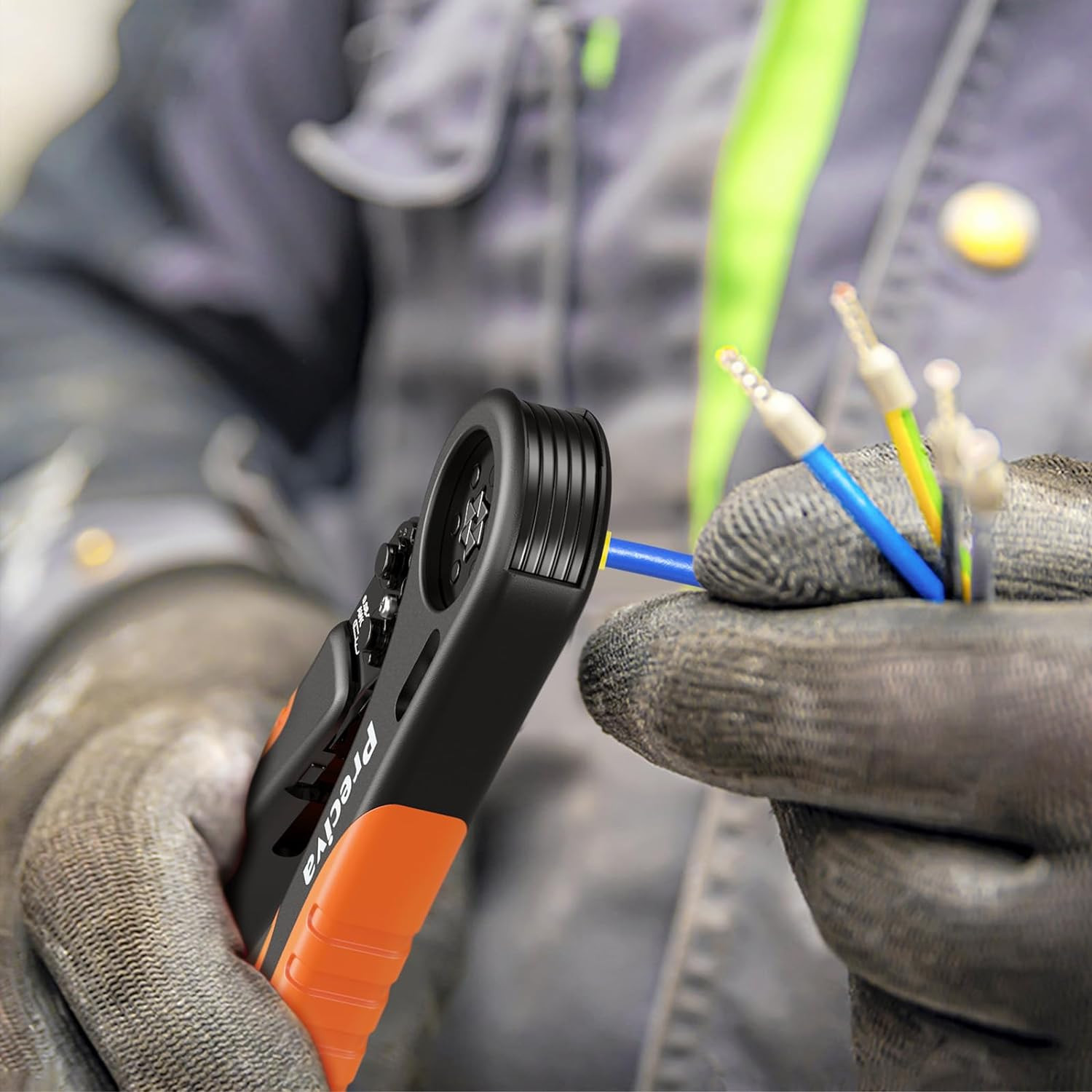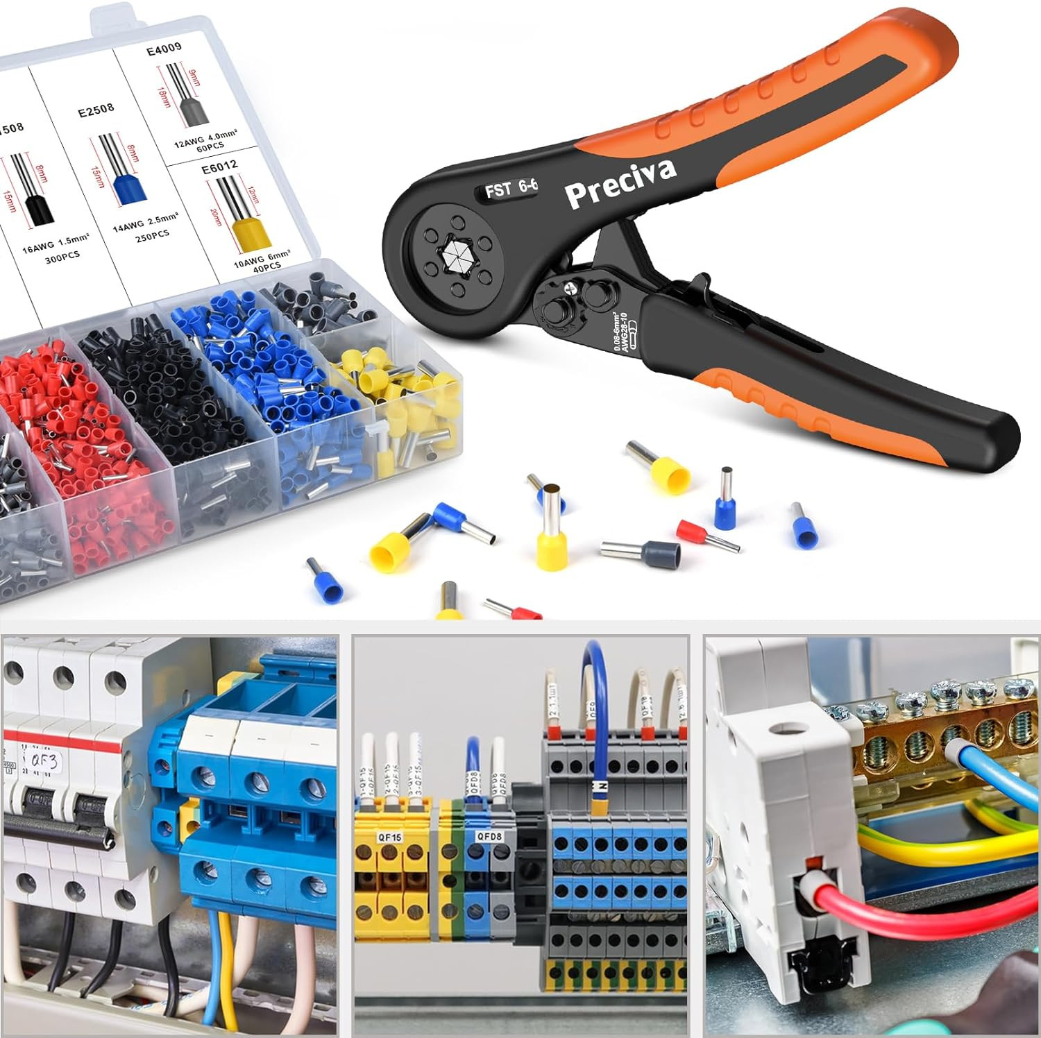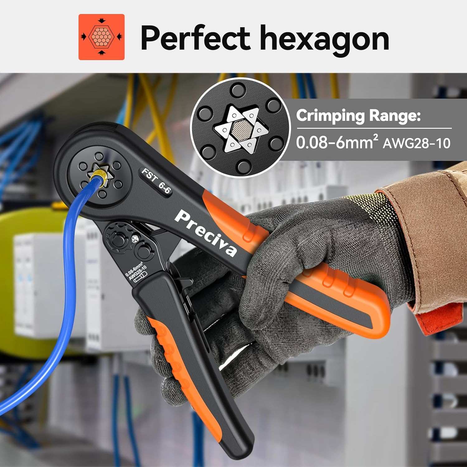 Material Nylon Batteries Included? No Model CP64200 Package Dimensions 12.28 x 8.07 x 1.42 inches Included Components 2000PCS Wire Connectors [AWG 28-10 & 0.08-6mm²]: This new Preciva ferrule crimping tool could be suitable for AWG 28-10 Wires, and the crimping range of the crimper tool is 0.08-6mm². It can be used for insulated and non-insulated wire ferrules connectors.[Unique & New Design]: This crimping tool comes with New appearance design, full edge design. Special SIX-Mandrel crimping style for hexagonal crimping. Unique design of the six spindle curl style.[Ratcheting & Labor Saving]: Labor-saving ratchet design. The non-slip nylon handle with lever principle is designed for improving crimping effects. Adjustable Ratchet and Lever Action Construction reduces fatigue degree. Ergonomic handle for easy operating.[Manual Pressure Adjustment]: You can adjust the crimping pressure by using the scews. It can manually unscrew the screws at the astrolabe, and use a hard object to quickly move the astrolabe to adjust the pressure.[2000 PCS Wire Ferrules Connectors]: Every order comes with 2000 PCS insulated wire-end ferrules. These connectors are suitable for AWG 28-10 wires. Terminals are sorted in the box and