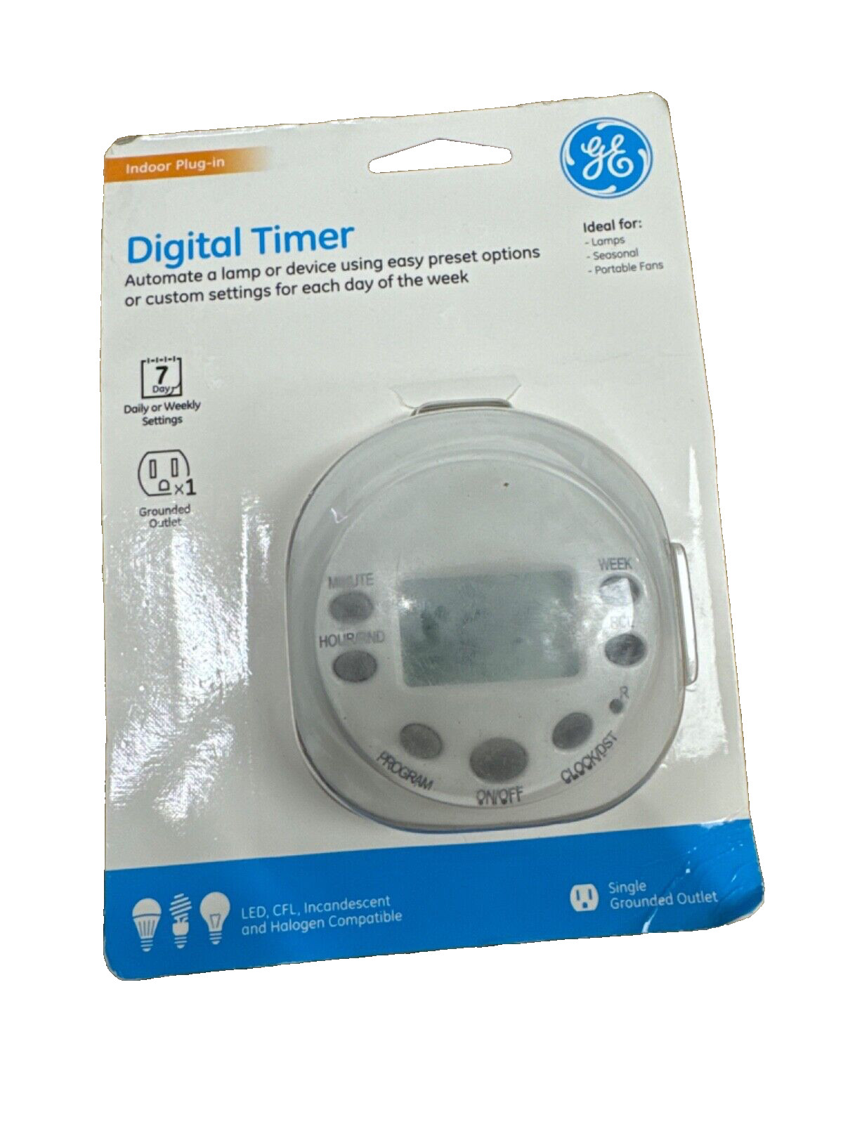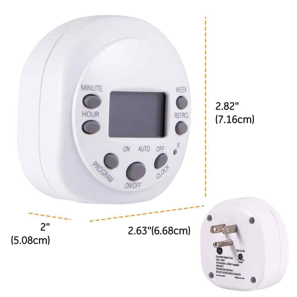 specifications__cell @media only screen and (max-width:767px) label:before .container .main_body .title .main label .top_menu ul li .top_menu ul li a .left_sidebar .description table tr .product_gallery>img } Store About Us Feedback Contact Us Description GE 7-Day Digital Heavy Duty Timer About This Product Save energy, save money and feel secure. The GE Plug-In 7-Day Digital Timer delivers convenient automation for lamps, seasonal lighting, portable fans, featuring a seven-day programmable schedule and a convenient override switch gives you ultimate freedom by providing a seamless transition between programmed settings and manual use. Automating your lights has never been so easy. The GE In-Wall 7-Day Digital Timer product is CFL ready, No wiring is required for installation. Highlights Automate lamps, seasonal lighting, or small appliances like portable fans - saving you time, money and energy! Turns lighting on and off at different times daily (7-day programmable schedule) -up to 16 settings per day. Features 1 grounded outlet and a convenient override switch to manually control the plugged in lamp or appliance. LED, CFL, Incandescent and Halogen Compatible Electrical Ratings: 125VAC 60 Hz: 15A General Purpose, 15A Resistive, 1250W 10A Tungsten, HP For use with lamps, seasonal lights and portable fans Dimensions Product Depth (in.) 2.82 in Product Height (in.) 6.85 in Product Width (in.) 4.88 in Specifications Amperage (A) 10 A Color Family White Color/Finish White Commercial/Residential Residential Cord Length (in.) 0 in Dial/Digital Digital Durability Not Applicable Electrical Features Programmable Indoor/Outdoor Indoor