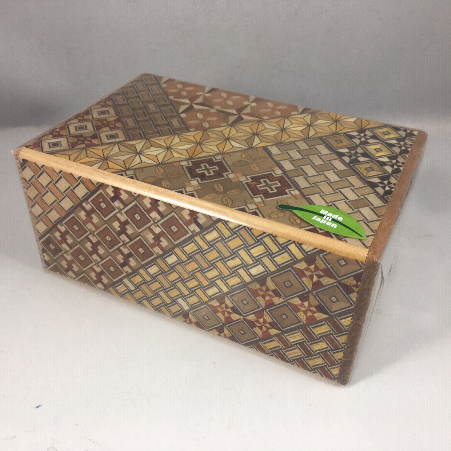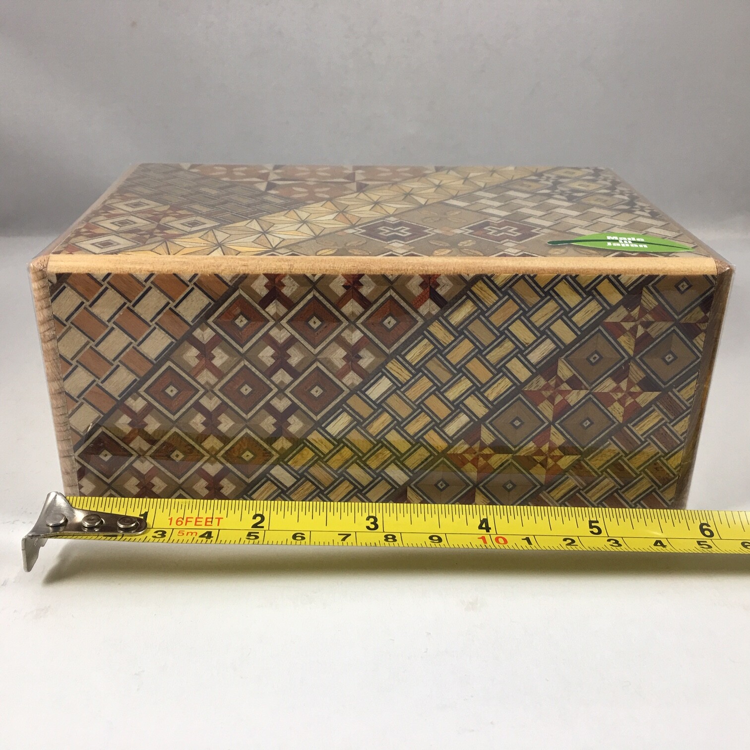 Japanese Yosegi Puzzle Box Samurai Wooden Secret Trick Box HK-134Yosegi Himitsu Bako/ Japanese Puzzle Box is the traditional Japanese Secret box originated in Japan's culturally rich Edo Period. It was first used by Samurai to send secret messages. The surface of the box is covered with Yosegi, traditional Japanese wooden mosaic. Even nowadays the Puzzle Box manufacturing process is not automated and each box is handmade in Hakone region by Japanese masters.Handmade by Japanese Yosegi masters in Hakone regionBeautiful craftsmanship originated in Japan's Edo PeriodSize: approx. Size: 3-7/8"W x 5-7/8"D x 2-1/2"HThis trick box takes 21 steps to openSecret locking/unlocking mechanism used by Samuraismodel number: HK-134High quality made in JapanEach puzzle box is slightly different. You may receive a box which has a slightly different pattern from the picture because each puzzle box is unique handmade by Japanese masters.These boxes have no apparent method or place of opening. However, if you look carefully, you may find panels or surfaces which will slide. Each style of box has a specific number of steps, which must be performed in proper sequence, in order to open it. (Directions for solving the puzzle are included with each box.)