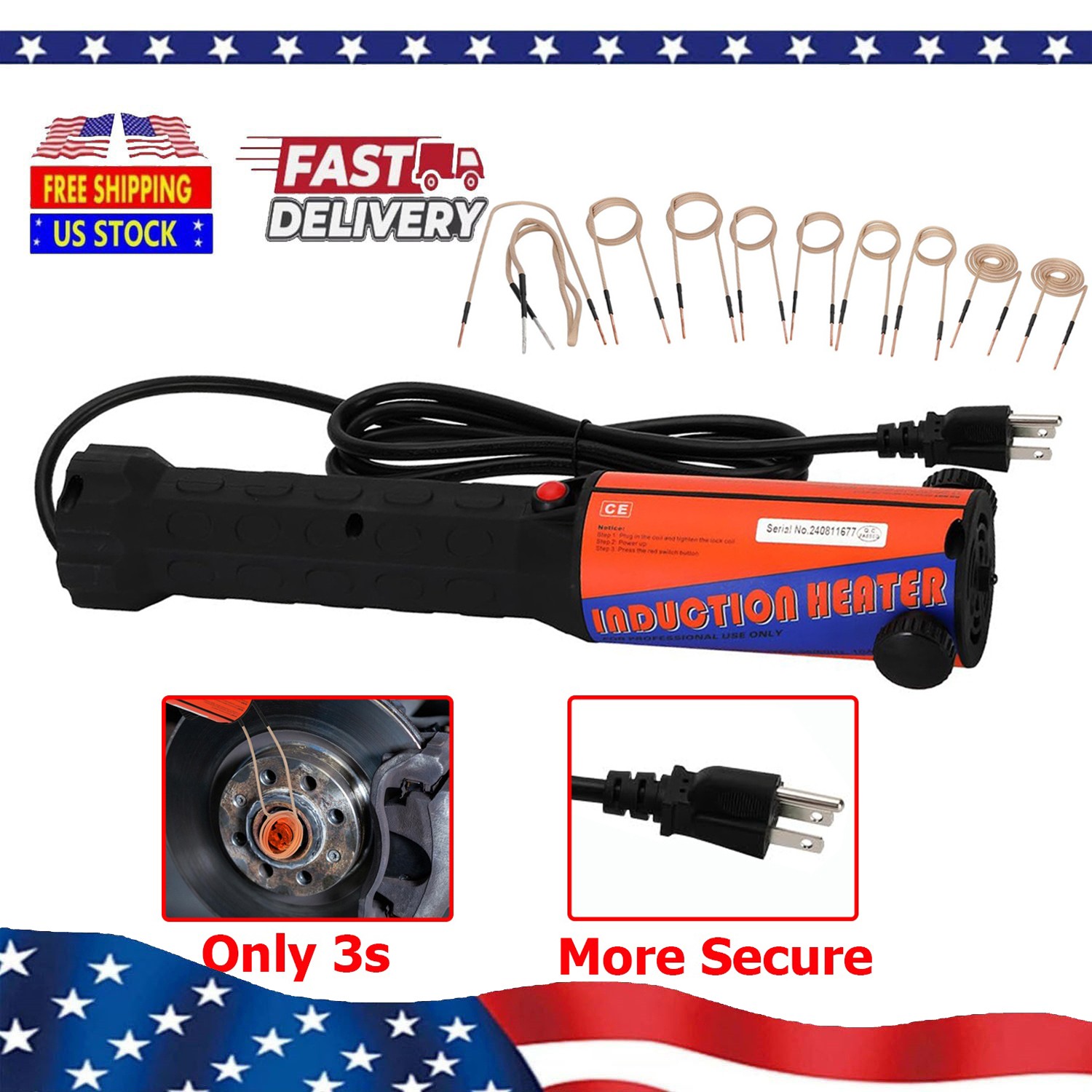 110V Magnetic Induction Heater Kit Induction Heater Bolt Removal for Rusty ScrewFeatures:【High Heating Efficiency】The induction heater bolt removal tool by using the eletromagnetic fields to heat the metal, which is faster and more precise and efficient than oxy-acetylene system. The induction heating tool do not flame is generated during heating, ensuring your work safety.【Wide Range of Uses】 The magnetic induction heater kit mainly used for heating threaded nuts and rusty screws to loosen them. It can also be used for automobiles, machinery, and various small Heat treatment of metal parts such as gears, pulleys, pulley, bearings, etc.【Ergonomic Design】The built-in LED light at the end of the induction tool allows you to work smoothly in the dark; The granular bolt-on bolt removal heater is ergonomically designed for a more comfortable grip.【Cooling System】 Bolt heater tool with a cooling fan and an overheating protection device, this system prevents damage to nearby heat-sensitive components during heating, thereby extending the lifespan of the equipment. The induction screw heater fan operates only when the power is connected and automatically shuts off when the power is disconnected.【Induction Heater Carrying 10 Coils】The induction heater comes with 10 coils, the coils can be bent in any way to meet a variety of work requirements. The handheld magnetic heater is easy to pack for storage and transport.Description:Item Name: Magnetic Induction Heater KitItem Weight: 6.54 poundsProduct Dimensions: 18 x 5 x 10 inchesItem model number: Induction Heater Bolt Removal ToolColor: RedStyle: Bolt Heater Induction Heater 10 CoilsPackage Includes:1x Magnetic Induction Heater Kit10x CoilsProduct Description induction heaterInduction bolt heater kit mainly used for heating threaded nuts and rusty screws to loosen them.The heat induction tool can also be used for automobiles, machinery, and various small Heat treatment of metal parts such as gears, pulleys, pulley, bearings, etcClearly visible in the darkWhether it's a dark night or the underside of a car, induction heaters help you light up and target metal parts PaymentShipping and DeliveryAbout usFeedbackPaymentPayPal preferredPayments are expected within 7 days after the last winning auction is closed; Otherwise Unpaid Item Dispute will be filed with eBay.Immediate payment is required for all orders.Shipping and DeliveryIt is shipping from USA. We process and dispatch your purchase within 2 business days after payment clearance.Delivery Time is about 3-7 business days to most of countries.The tracking number will be given for the customer to check the shipping status online (registered or faster service only).If you want to the change the address, please email us when you buy it.Otherwise we will not take responsibility for the package which has been sent out already.About usWe stand behind every product we sell.All of our brand new items come with a 30-Days money-back guarantee.Please contact us first for authorization, so we may discuss a better solution.FeedbackIf you have any questions, please contact us. We are striving for 100% customer satisfaction. We will appreciate, if you can give us a positive feedback.If you have any question, please contact us through eBay message before open a case and we will gladly assist you. Thank You!We are all here to help, please contact us through eBay message before leaving any negative/neutral feedback.
