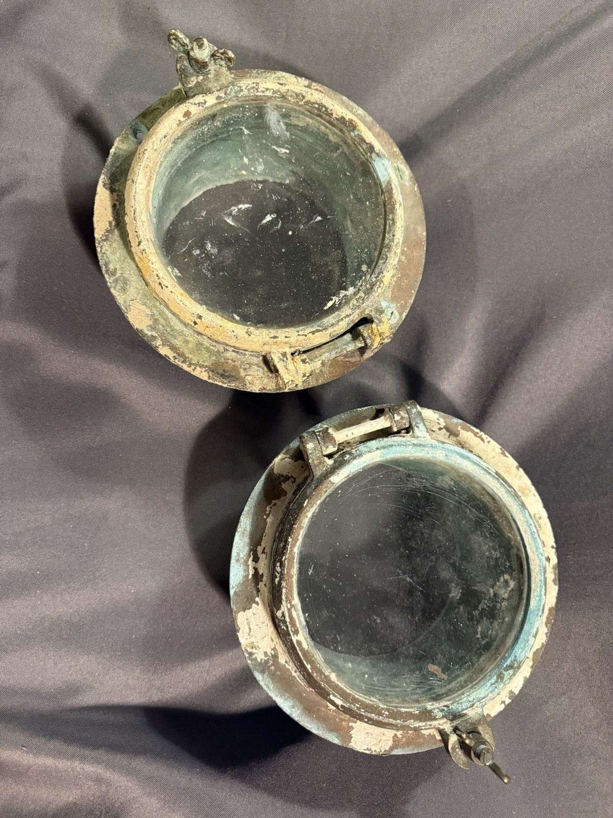 Very cool matched pair of portholes in decent condition for age and use. They both do open, but they do stick a bit. Great old surface of crusty paint and verdigris patina. Solid and sturdy, could likely be a functional lot with some cleaning and maybe some new gaskets. Please use photos and zoom feature for most accurate condition. Each measures 9” in diameter and 5.5” deep. Possibly shipped FedEx where cost prohibits USPS.PLEASE READ BEFORE BUYING: Larger items shipping FedEx cannot be delivered to a PO Box, please add a home address before buying a larger item or reach out to me for other arrangements. Please make offers and max bids considering shipping cost. Do not expect further discounts after I accept an offer or a winning bid is accepted. If you have any special requests for shipping (insurance, how it is packed, etc.) please get them approved before purchasing. Any questions must be answered before the sale. I reserve the right to cancel an order where buyer asks questions about item or makes any special requests AFTER completing the sale to save both of us time, money & hassle. Almost everything I offer is old and has likely spent time in a basement or garage. If you are sensitive to musty smells please ask me to do a thorough sniff check to avoid hassle of returns!!!! Look closely at photos & ask lots of questions because item is sold AS IS AS SHOWN ALL SALES FINAL. Returns are accepted in the case that I make a mistake or item was grossly misrepresented, but returns will be accepted at the shipping expense of the buyer. Refunds will not be given until the item is received in good condition and they will not be considered if it is more than a few days after the item was received by the given address. If an item arrives broken, it must be called to my attention within TWO DAYS of package arrival or I will decline all refunds regardless of insurance. I do my best to get back to everyone in a timely fashion. If you don't hear a response within 48 hours please ask question again! Shipping quotes are FOR THE LOWER 48 STATES ONLY!!! Alaska and Hawaii residents: I appreciate your business and will do my best to ship an item affordably but please contact me before cashing out for an accurate quote. Also, make sure to check my other listings for more great vintage finds- I will certainly do my best to work with you if you are purchasing multiple items. Thanks for looking! I love bringing the old and unique back to market & I'm constantly adding inventory so please check back often. You never know what I'll find next!