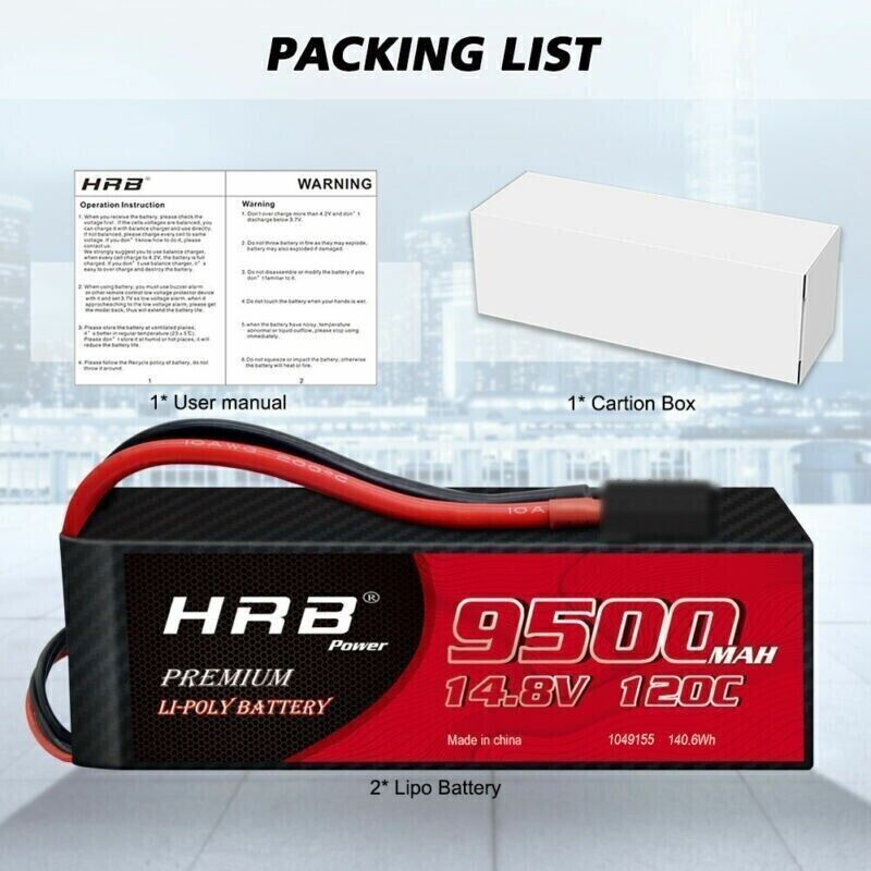 :) Recommended Products 2pcs 11.1v 3S 50C 5000mah Tr 2pcs 14.8v 4S 50C 6000mah Tr 2pcs 14.8v 4S 120C 9500mah Tr 2pcs 14.8v 4S 120C 9500mah EC5 2pcs 22.2v 6S 50C 5000mah EC5 2pcs 22.2v 6S 100C 5200mah EC5 Specifications Type of battery LiPoContinuous Discharge 120C Total Capacity (mAh) 9500 Connector Type Tr Cells 4S Battery Length 165mm/6.5inch Voltage per pack 14.8V Battery Width 50mm/1.97inch Suggested Charge Rate2CBattery Height41mm/1.62inch Balancer Connector TypeJST-XHR-5PBattery weight 771g/1.69lb Max voltage Silicone wire 10awgPackage included 2x battery Application Specially designed For RC Car, RC Truggy, RC Boat, RC Helicopter. For RC 8s XRT X-Maxx/Maxx v2 / Unlimited Desert Racer, For RC Arrma 8s Kraton Outcast(Need to be replaced with EC5 plug), etc. Only if the voltage, dimension and plug match, then it will fit. Caution To double make sure safety, please have a check first whether the battery surface is alright when you get it and whether the voltage is normal before using.Read and follow all manufacturers charging and handling instructions, warnings, and precautions before use!If the new lipo battery won’t hold a full charge or loss the charge very quickly in short time, please use Professional lipo battery Charger to charge and recycle several times first. For most lipo battery, the safest charge rate is 1C - 2C.Never Over-charge above 4.2V per cell and Over-discharge below 3.0V per cell.DO NOT charge with a NiMh only charger.ALWAYS confirm charger settings match this battery prior to charging.LiPo batteries pose a severe risk of fire if not properly handled and charged per the instructions.NEVER leave batteries unattended during charging.Never allow children under 14 years old to charge batteries without the supervision of a responsible, knowledgeable adult.ALWAYS charge batteries in a well-ventilated area.REMOVE flammable items and combustible materials from the charging area. Warranty Our items come with 180-Day warranty. Our warranty does not extended to any products that are physically damaged or that are not under normal operating conditions as a result of misuse or improper installation on the buyer/user's part.All product comes with 30-Day Money Back Guarantee.Please contact us for a return authorization number by opening a return case on Ebay. We stand behind every product we sell. If you're not pleased with your purchase, we'll be happy to make an exchange or refund. Online time:(Monday-Friday)18:00-03:00 (Los Angeles) 20:00-05:00 (Chicago) 21:00-06:00 (New York) Payment Your can choose from any of the following payment methods:VisaMastercardDiscover American ExpressPayPalPayPal CreditApple Pay (through the eBay app and mobile website only)Google Pay (through the eBay app, mobile website and desktop) NOTE: Payment should be sent within 1-3 (Three ) days of auction closing. Or unpaid dispute will be filed for closing auction. Shipping All items are shipped to you from our warehouse in the USA.Will ship within 1-2 business days of receipt of payment. All items will be shipped to buyer's eBay address. Before you pay, please make sure your address on eBay matches the address you would like us to ship to. Normally we use USPS to ship packages. We can ship packages to Alaska, Hawaii, and PO Box addresses. However, sometimes due to the policy update of the logistics channel, the delivery to Alaska and Hawaii will fail. In this case, we will get in touch with you in time. Our services HRB provides a 6-month warranty period. The after-sales is as follows; The free has: if the battery has any quality problems within one month from the date of order placement. The buyer need to provide inspection pictures. Once confirmed we will arrange a free return. 1-3 months: if the battery has any quality problems , the buyer need to provide inspection pictures. Once confirmed we will arrange new battery to buyer. The buyer bear the freight. 3-6 months: if the battery has any quality problems , the buyer need to provide inspection pictures. Once confirmed we will give the clients discount when order new lipo. Feedback Customer satisfaction is very important to us. If you have any problem with your order , please contact us and we will do our best to make you satisfied, please do not leave a negative feedback before we resolve your problem.Your feedback is very important to us it affects our search placement on eBay. You will receive our positive feedback as soon as you pay for your item.We answer questions usually within 24 hours, usually quicker. About us Welcome to our shop! We are a professional battery wholesaler with our own factory located in China. Company is concentrate on manufacture Lithium Polymer Batteries and we are one company that on research,production and sales as one of the high-tech Lithium Polymer Battery manufacturer.We have first-class quality control system and perfect return solution to ensure that we provide high-quality product experience and excellent service to our global customers. All items sold by HRB are sold as "New: A brand-new, unused, unopened, undamaged item." We do not sell used, opened, or damaged items. If an item is damaged during shipping, please see our Returns section to arrange a return.