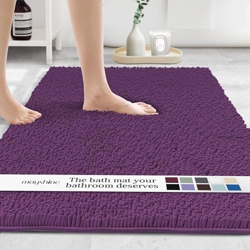 This Plush Shaggy Chenille bath mat in plum is a rectangular 47 x 27 inch rug designed for bathroom use. It features a shaggy chenille surface for a soft feel underfoot. Item condition is New. Shipping is Free Shipping, so there is no additional delivery cost at checkout. Check the listing for details on thickness, backing, care instructions, and any included packaging or accessories.