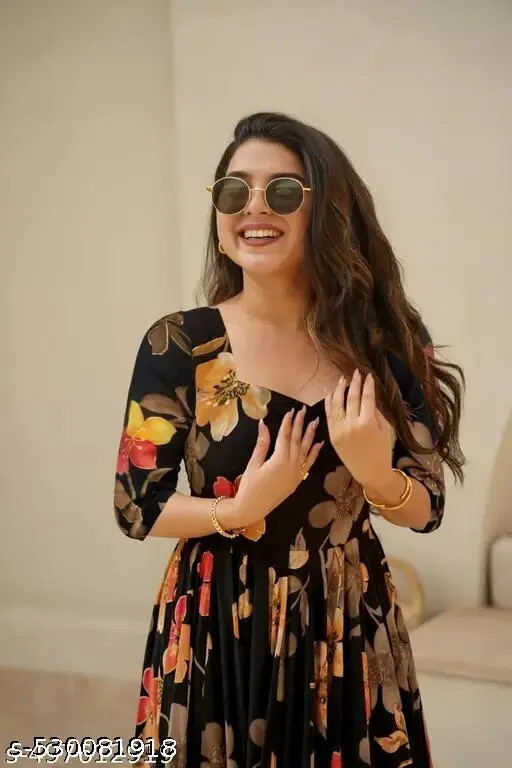 Indian Women Black Georgette Floral Printed Anarkali Gown Dress