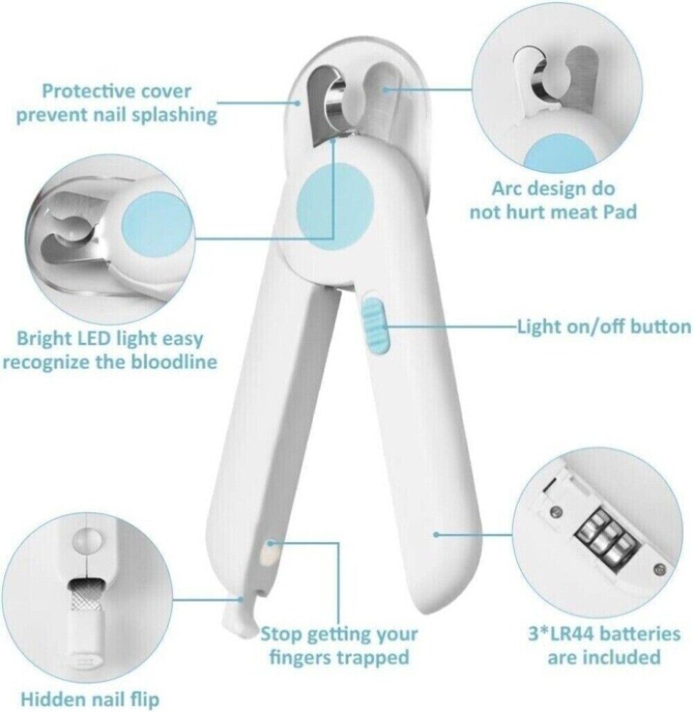 Product Description: LED Light Pet Nail Clipper, Dog & Cat Pets Nail Clippers and Trimmers, Pet Nail Clippers with LED Light to Avoid Over-Cutting, Hidden Nail File & Razor-Sharp Blade, for Small Animal Grooming Feature: 1. [High Brightness LED, Safe and Convenient] - Lightweight, convenient and comfortable, there are high-brightness LED lights to see the cat's nails bloodshot clearly and avoid hurting the small cat. 2. [Extra-thick Stainless Steel, Sharp and Durable] - Sharp blades are made of high quality stainless.can cut pet nails of about 2mm. 3. [Accessories: 3 Batteries, 1 File] - Our packaging is accompanied by 3 batteries, There are three batteries, which have a good battery life and can be used for about two years. Built-in file for grinding after nail removal. 4. [High Transparent Anti-splash Cover] - When trimming nails, nail fragments will splash everywhere, it is difficult to collect and clean. Our high-transparency splash shield stops debris splashing and facilitates cleaning. 5. [User-friendly Design] - Professional cat nail clipper conforms to ergonomic design, easy to grasp, labor-saving, anti-slip, can be safely put in hand, ensure convenient use, prevent accidental scratches and cuts. Package Included:1x LED Light Pet Nail Clipper Cat nail clippers with protective cover and anti-nail splash Many pet owners choose, suitable for all kinds of small animals LED light with high brightness Steel knife about 2mm thick Pet nail clippers with protective cover Anti-splash Switch Hide File Storage Top About this item Similar Questions Product information Reviews