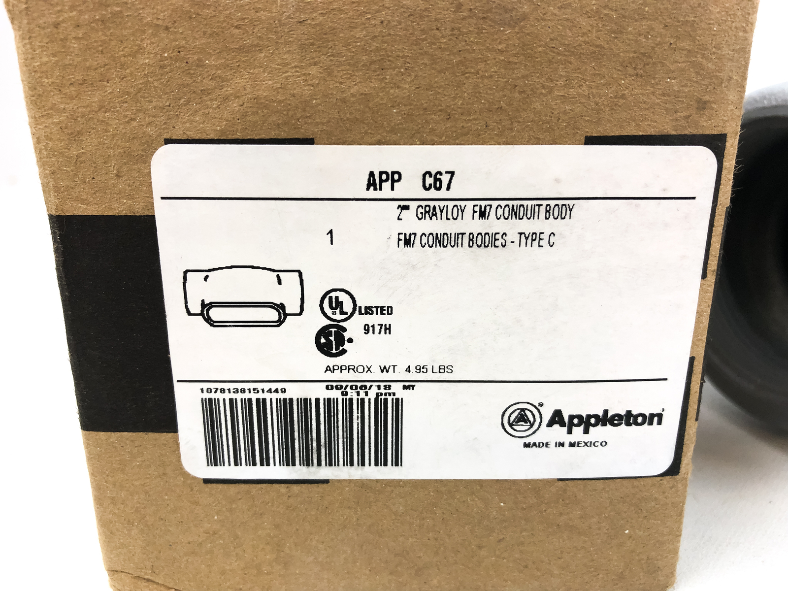 This Appleton APP C67 Form 7 conduit body (Type C) is listed as new and intended for use in business and industrial electrical installations. It is described as a 2-inch Grayloy iron conduit body for FM7 bodies. Check the listing for details on included components, markings, and compatibility requirements. The item ships with free shipping, and pricing is shown in USD. Review the full listing for any notes on packaging, quantities, and return terms before purchase.